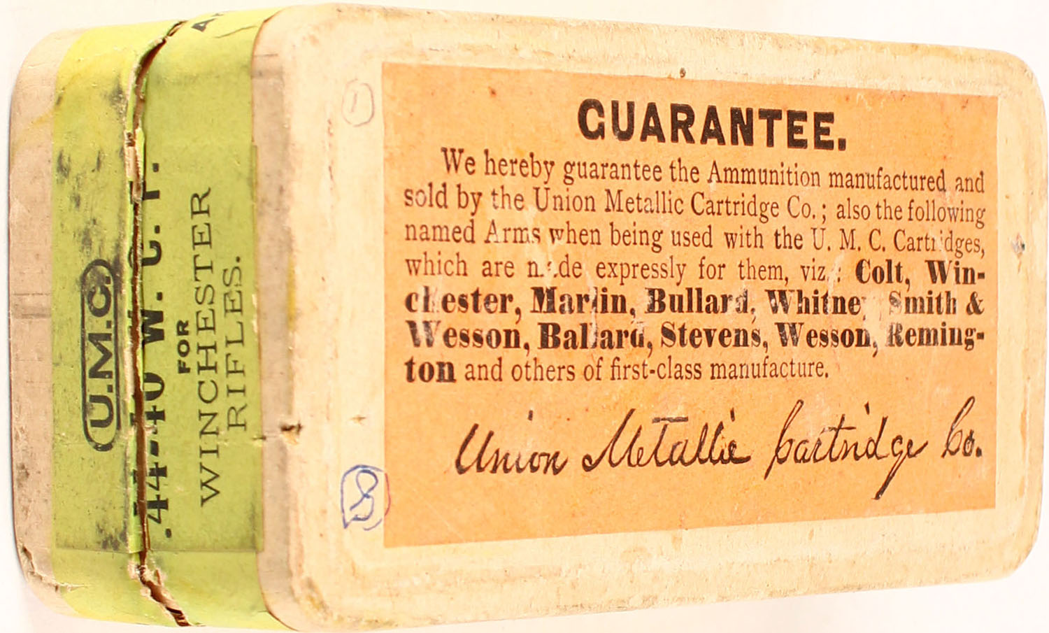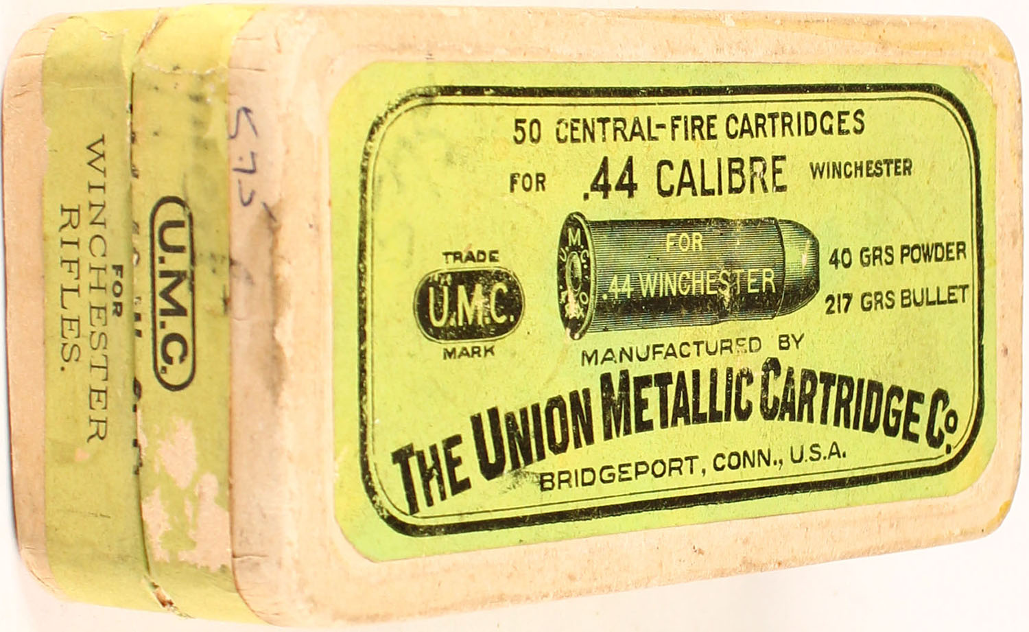 UMC, .44 Winchester, 40 Grs Powder, 217 Grs Bullet, Partial 44 correct H/s and 6 rds have a H/s of ''U.M.C. 44 C.F.W.'' but all cae and bellets apear the same, 2pc. Buff box with green top & side sealing labels, box is solid with great color, minor scuffing to labels, ammo is excellent Grade: Excellent - Value: 120 to 500