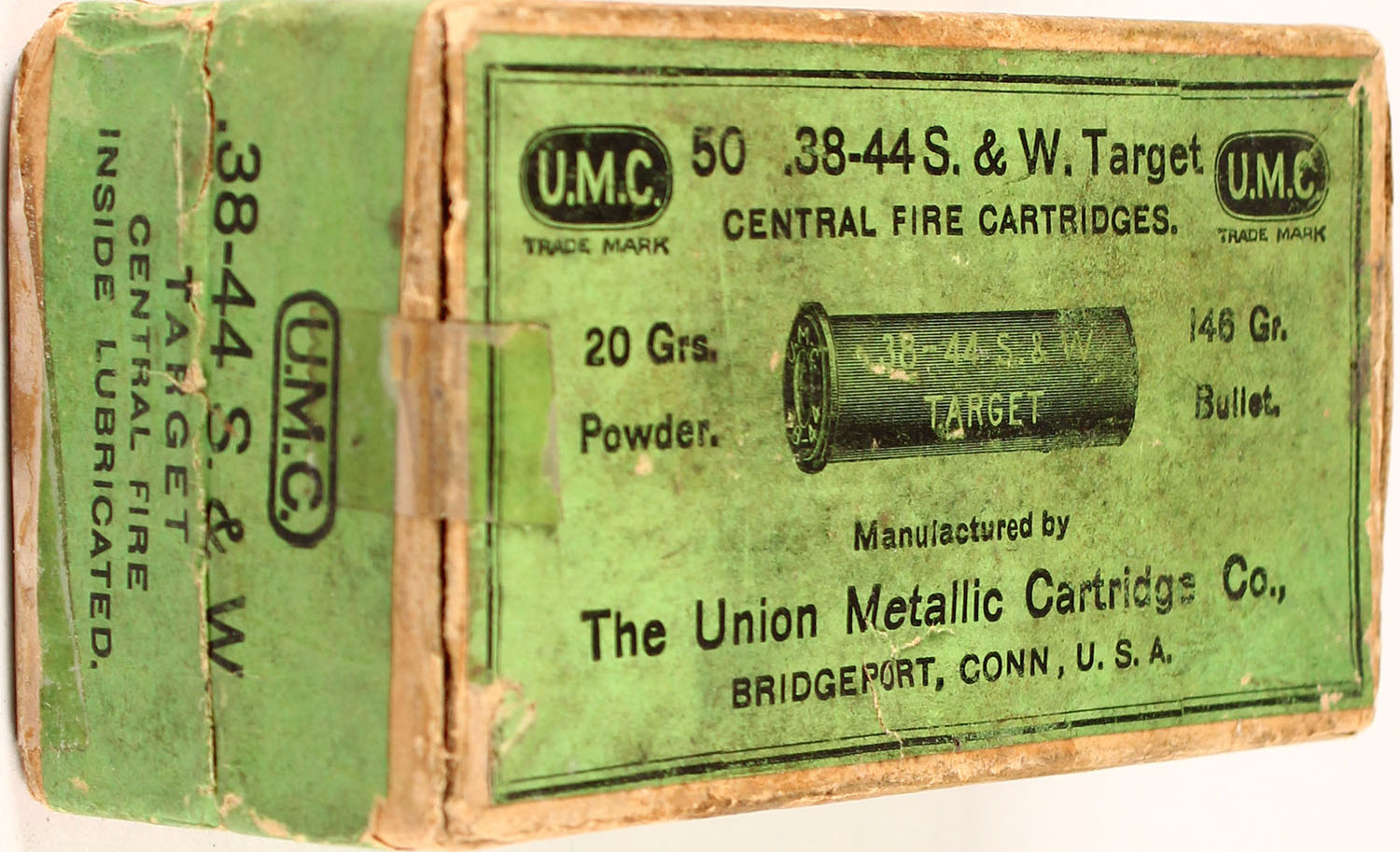 UMC, .38-44 S&W Target, Full, 2pc. buff box with green top & side sealing labels, box has seam splits, labels have scuffing and age soiling, ammo is very good. Grade: Good ++ - Value: 40 to 200