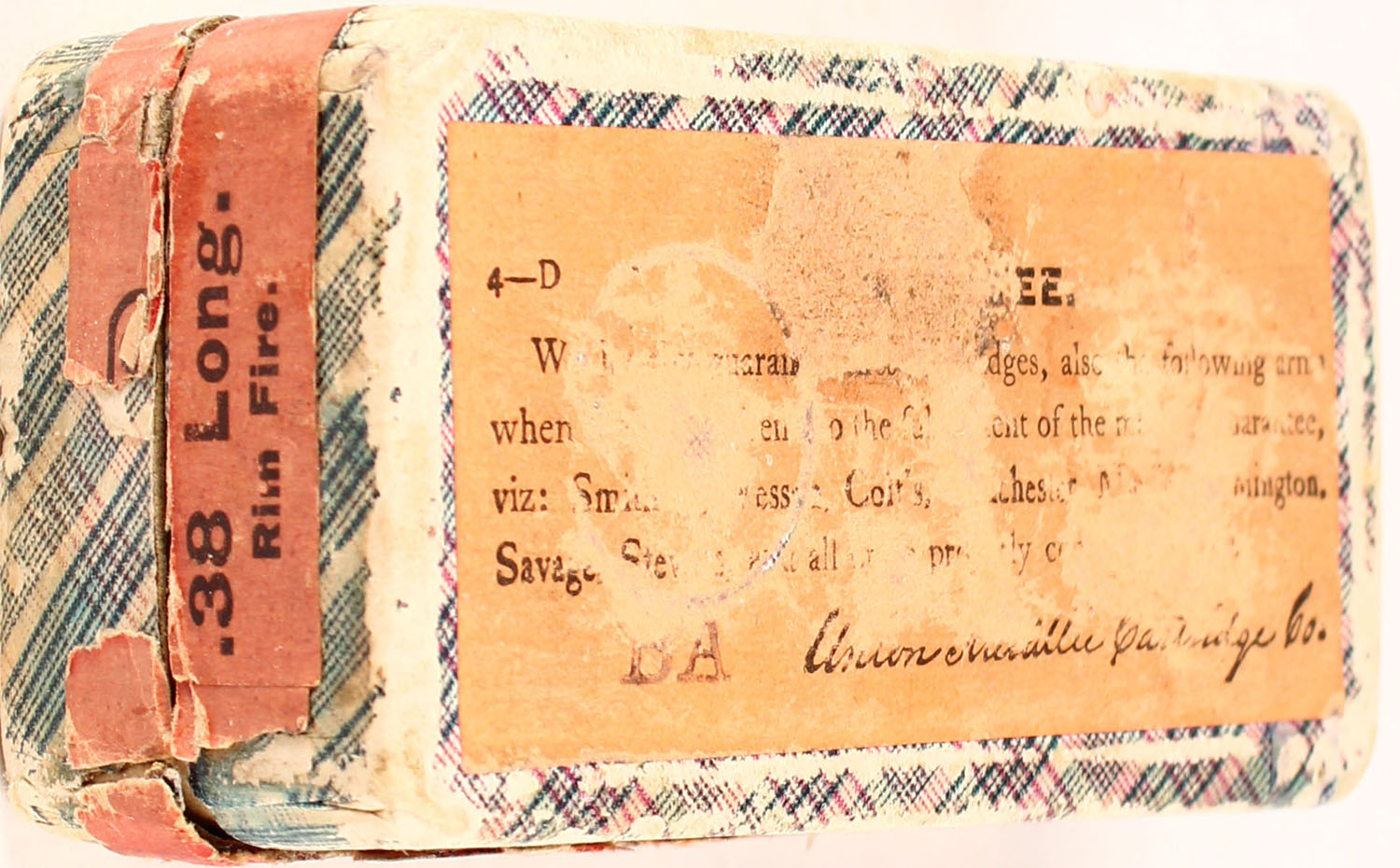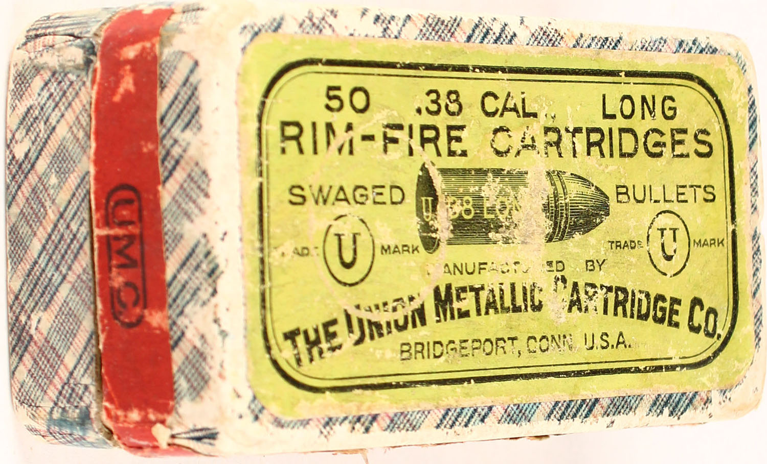 UMC, .38 Long Rim Fire, Swaged Bullets, Full, 2pc. Blue fabric box with green top & red side sealing labels, box is solid with very good color, very minor age soiling, shelf wear, edge & corner wear, labels are 80% intact. Grade: Very Good ++ - Value: 30 to 90