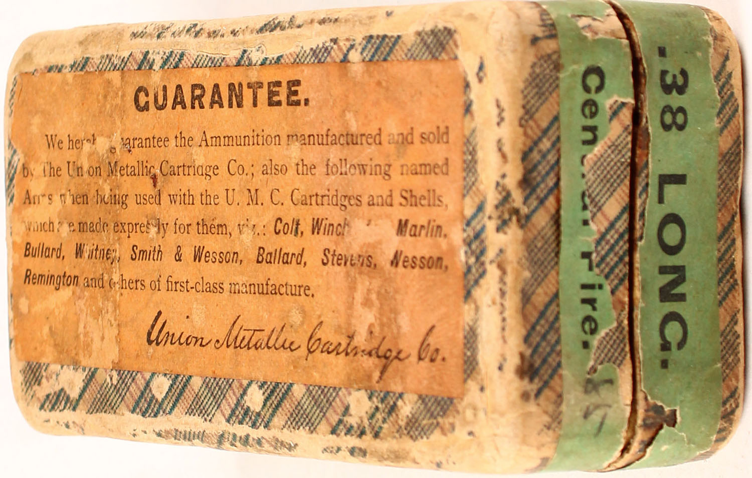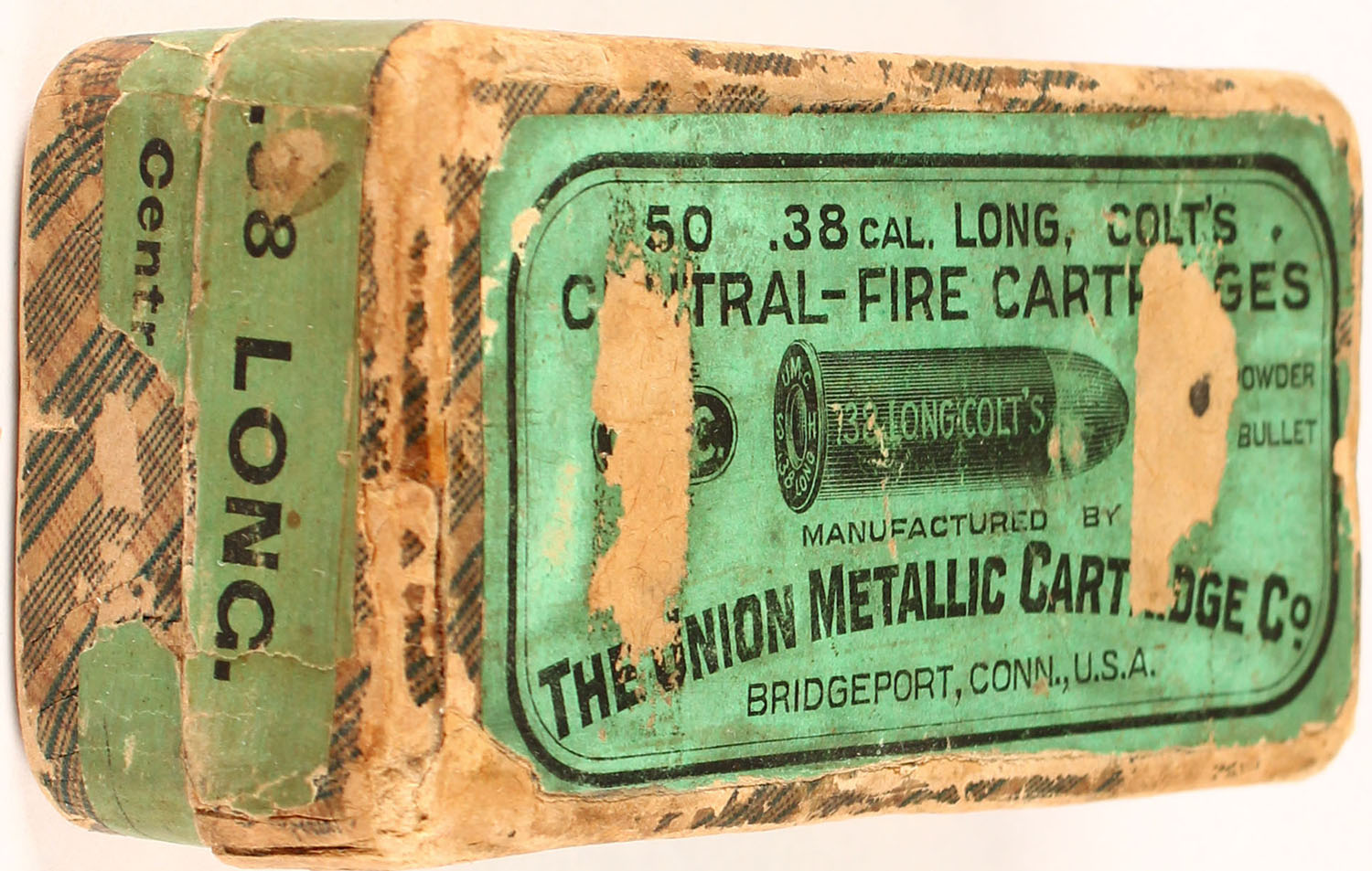 UMC, .38 Long Colt, Partial 40rds. Correct, 2pc. Fabric box with green top & side sealing labels, box is solid with very good color, age soiling, shelf wear, tape damage to top, & sides, edge & corner wear, labels are 90% intact, ammo is excellent. Grade: Very Good + - Value: 14 to 90