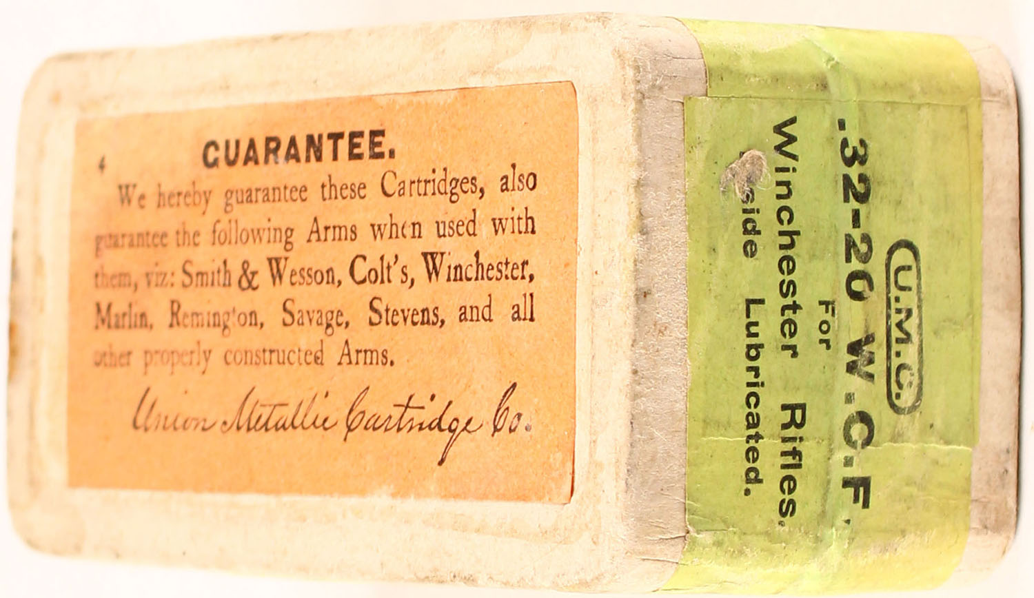 UMC, .32 Winchester, 20 Grs. Powder, 100Grs. Bullet, FULL & SEALED, 2pc. Buff box with green top & side sealing labels, box is solid with very good color, some age soiling & color fading, minor shelf wear, very minor corner wear, edges are mostly crisp, labels are 95% intact. Grade: Excellent - Value: 50 to 150