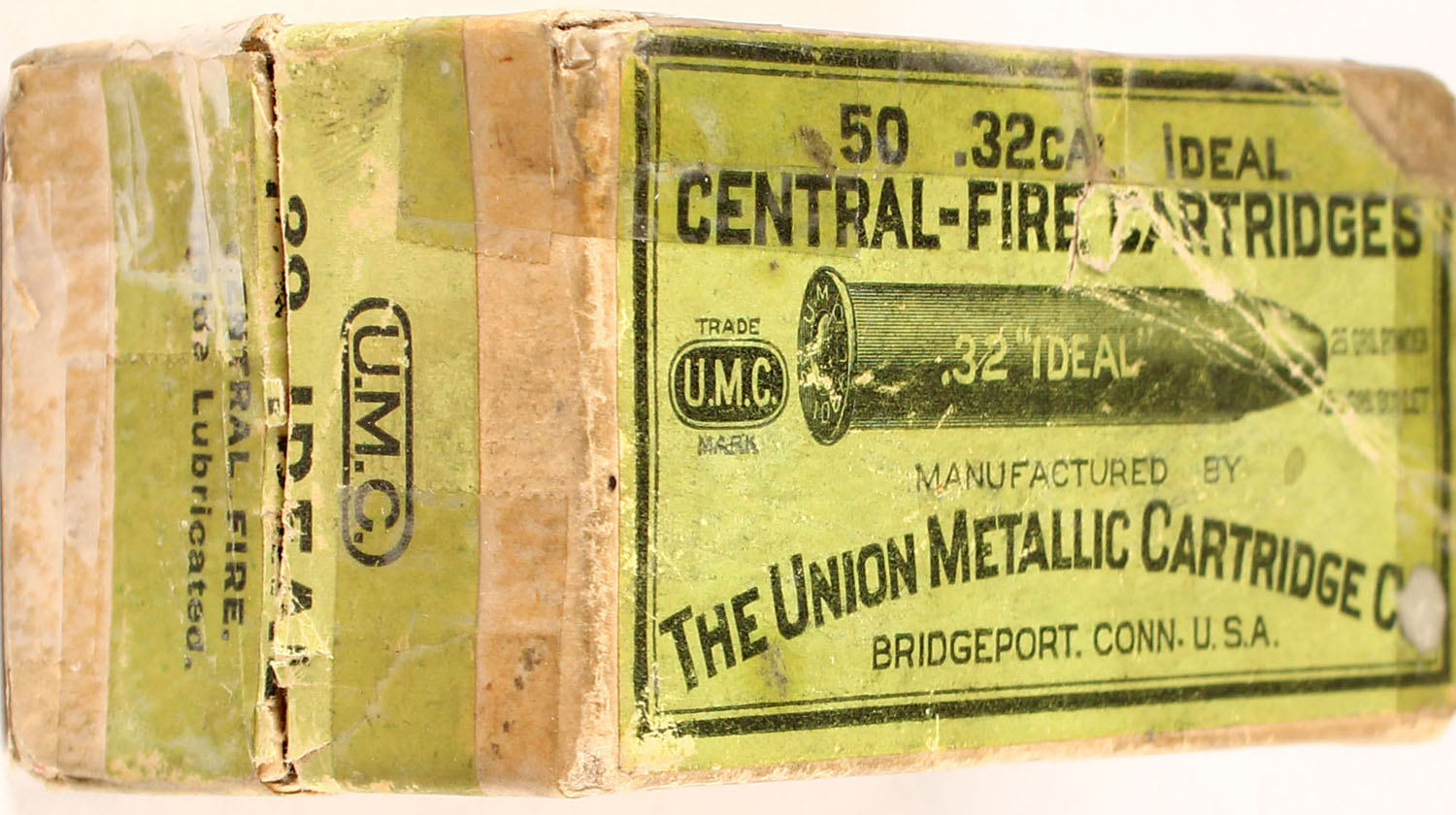 UMC, .32 Ideal, 25 Grs. Powder, 150 Grs. Bullet, Partial 9rds., 2pc. Buff box with green top & side sealing labels, box is solid with very good color, some age soiling, box has tape on all sides, front and bottom have been written on, minor edge & corner wear, labels are 99% intact, ammo is excellent. Grade: Very Good - Value: 10 to 60