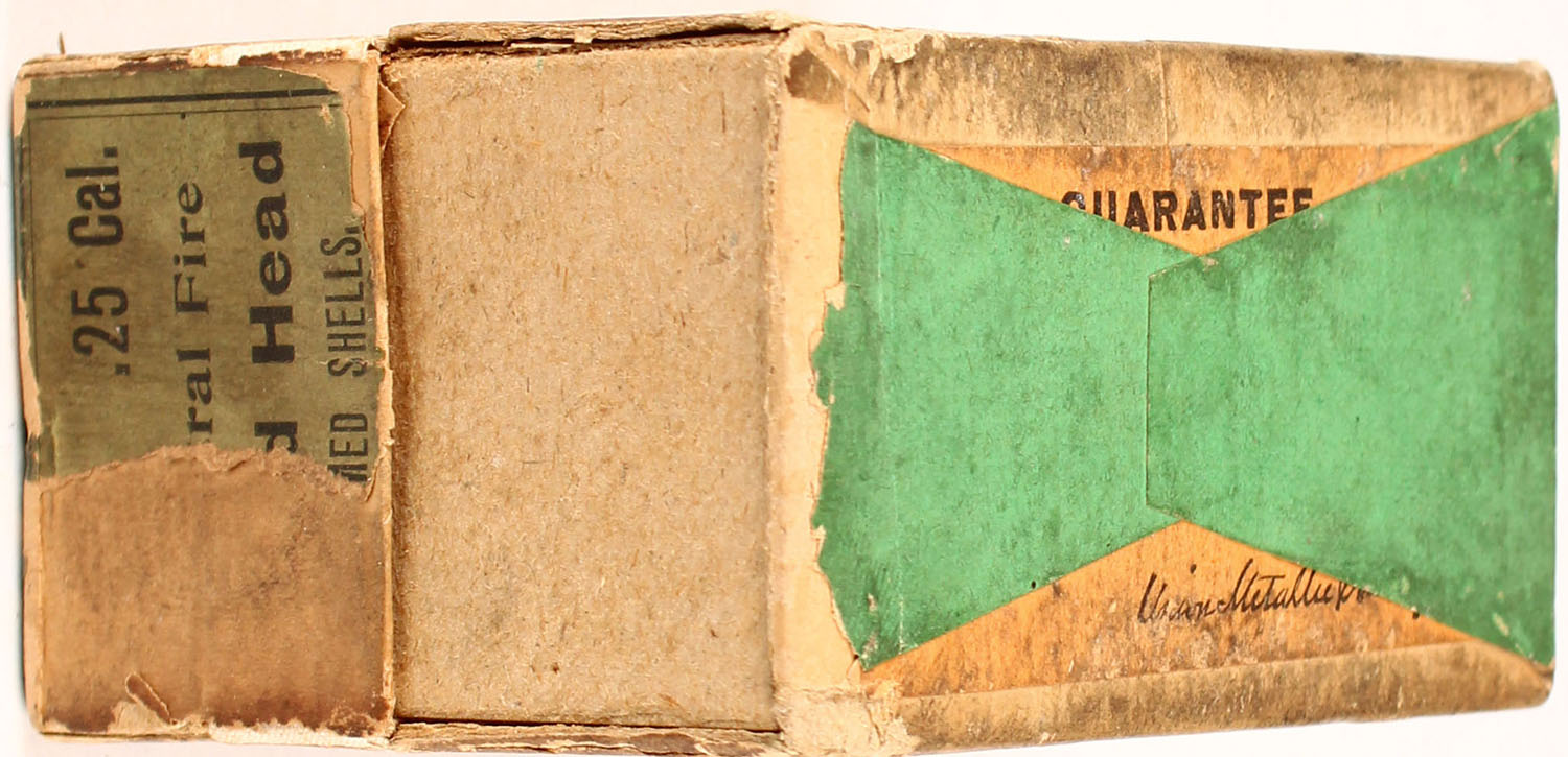 UMC, .25-25, Primed Metallic Shells, With UMC No 1 1-2 Primer, Full, 2pc. Buff box with green wraparound label, box is solid with good to very good color, age soiling, minor edge & corner wear, label is 80% intact, shells are excellent. Grade: Very Good + - Value: 10 to 50
