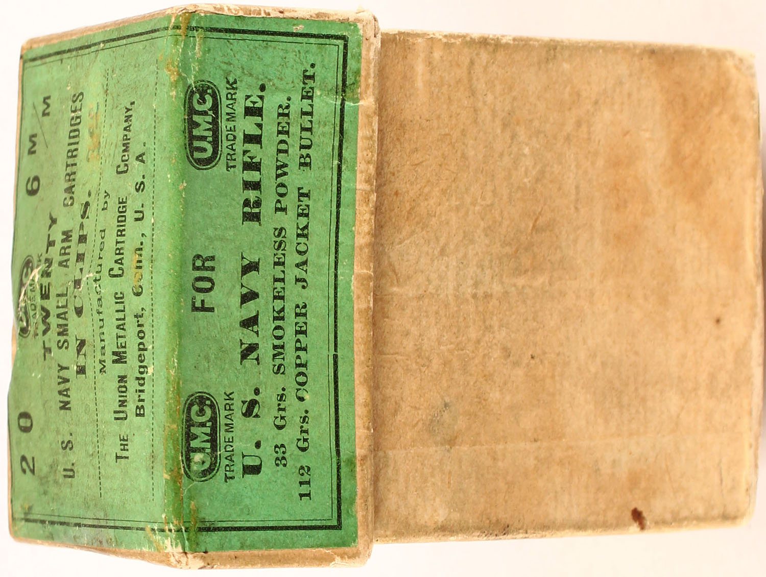 UMC, 6mm Navy, 33 Grs. Smokeless Powder, 112 Grs. Copper Jacket Bullet, Partial, 10rds. (2 Clips), 2pc. Buff box with green label, box is solid with very good color, minor age soiling, small puncture on top, very minor edge & corner wear, ammo is excellent. Grade: Excellent - Value: 10 to 300