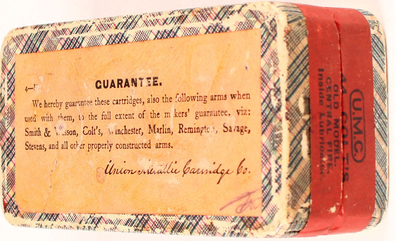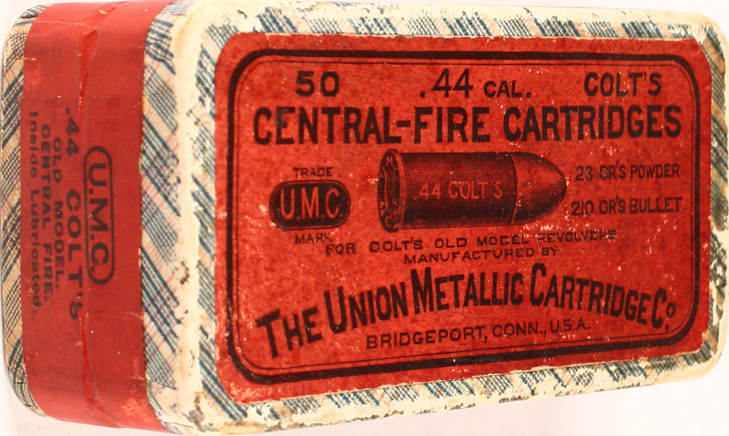 UMC, .44 Colt, 23 Grs. Powder, 210 Grs. Bullet, FULL & SEALED, 2pc. Blue fabric box with red top & side sealing labels, box is solid with excellent color, very minor age soiling & shelf wear, some edge & corner wear, labels are intact, bottom has been written on. Grade: Excellent + - Value: 100 to 300