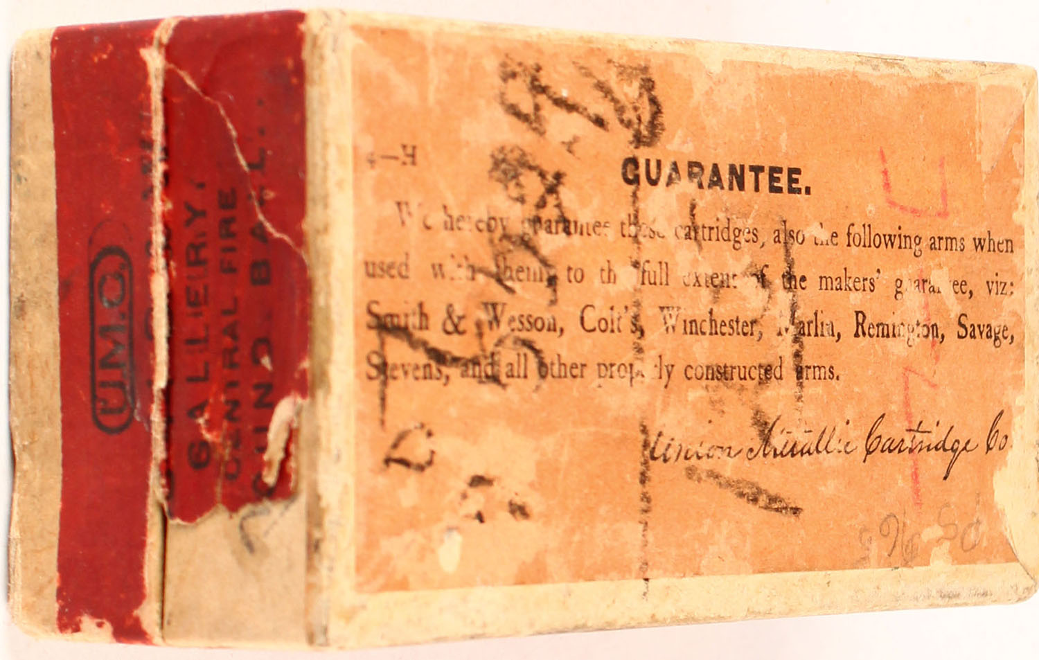 UMC, .38-44 Smith & Wesson Gallery, 6 Grs. Powder, 70 Gr. Round Ball, Full, 2pc. Buff box with red top & side sealing labels, box is solid with very good color, some age soiling, minor shelf wear, some edge & corner wear, bottom and left end have been written on, labels are intact, ammo is very good. Grade: Excellent - Value: 50 to 150