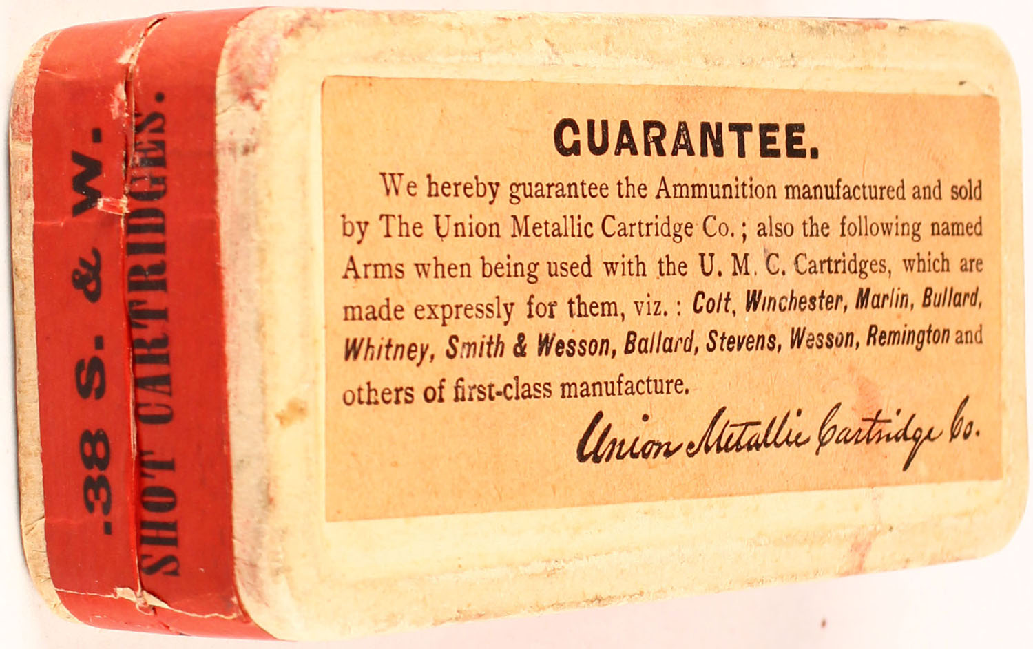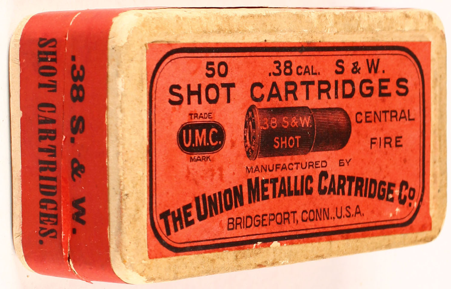 UMC, .38 Smith & Wesson Shot Cartridges, Full, 2pc. Buff box with red top & side sealing labels, box is solid with excellent color, very minor age soiling & color fading on top, very minor corner wear, edges are crisp, labels are intact, ammo is very good to excellent. Grade: Excellent + - Value: 20 to 60