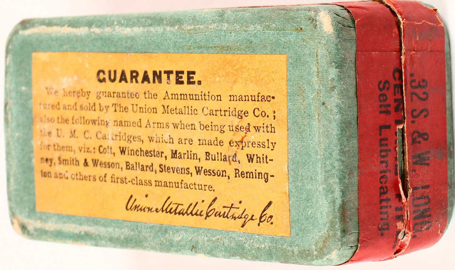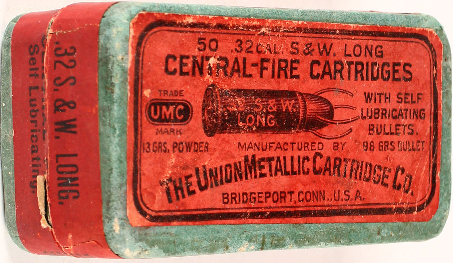 UMC, .32 Smith & Wesson Long, 13 Grs. Powder, 98 Grs. Bullet, Full, 2pc. Green box with red top & side sealing labels, box is solid with excellent color, very minor age soiling & shelf wear, edges are mostly crisp, labels are intact, ammo is excellent. Grade: Excellent + - Value: 30 to 90