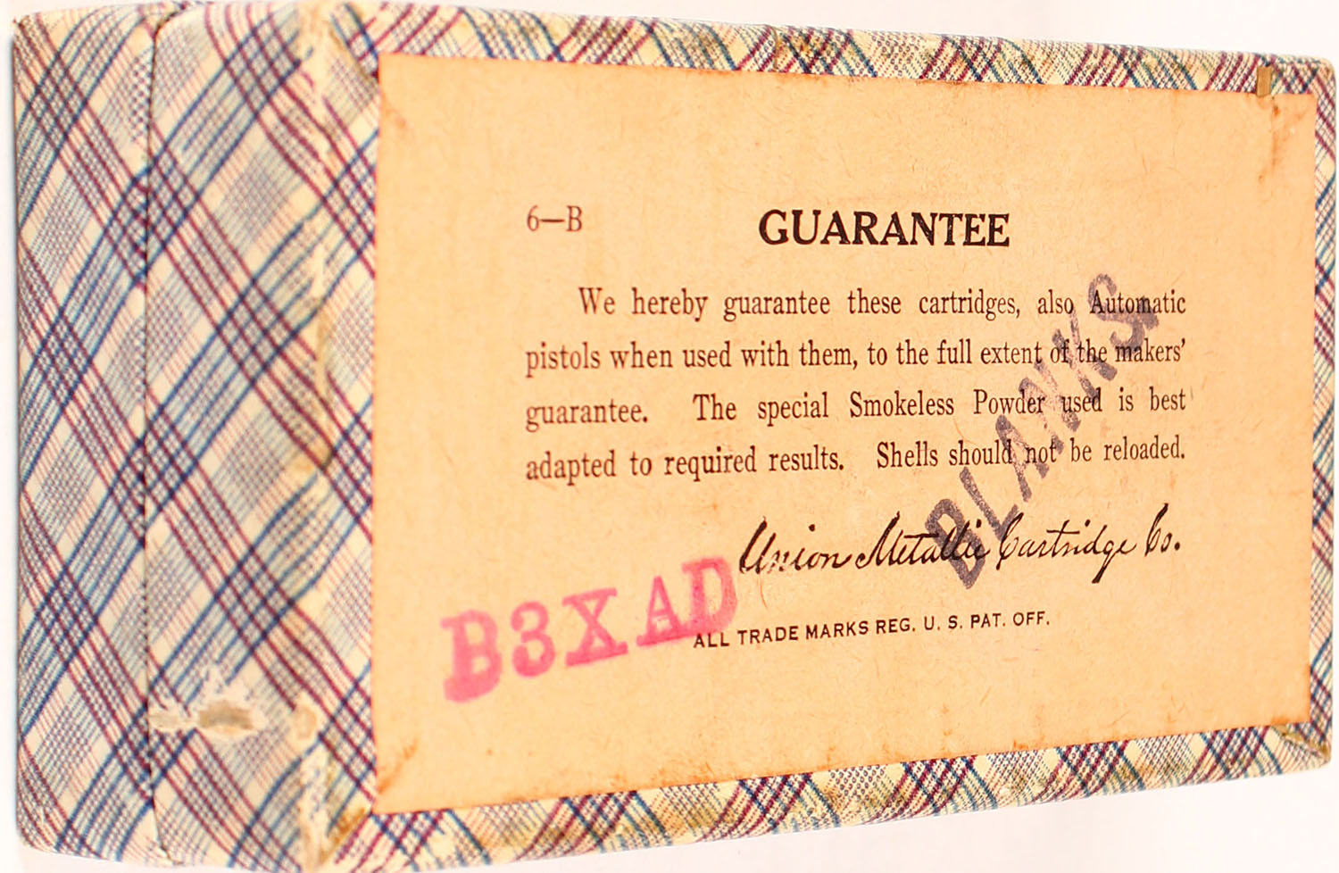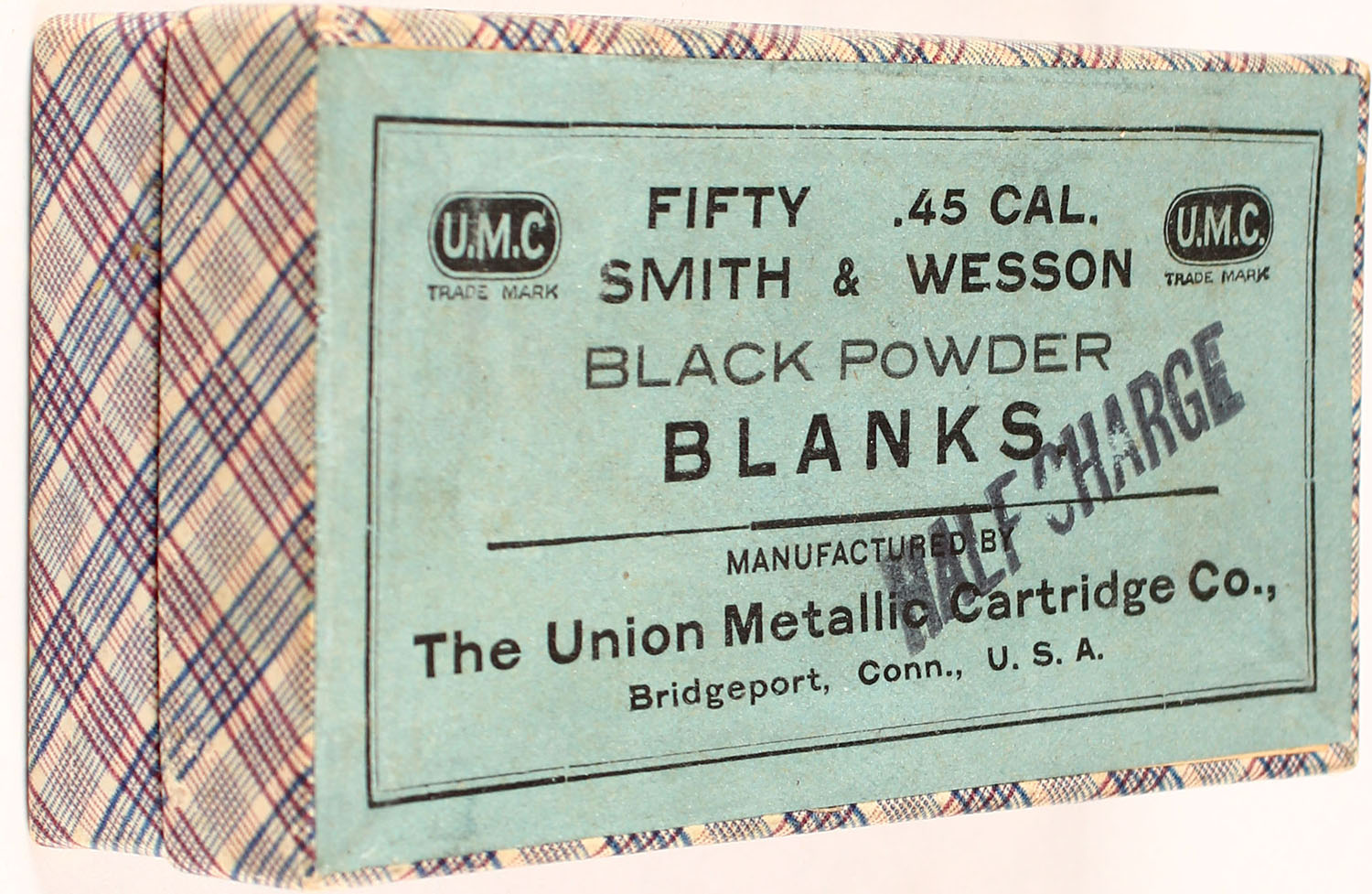 UMC, .45 Smith & Wesson, Black Powder Blanks, Half Charge, Full, 2pc. Purple fabric box with blue top label, ''Half Charge'' Over-Stamp, No side sealing label, box is solid with excellent to minty color, only very minor age soiling, & corner wear, corners are mostly sharp, edges are crisp, top label is intact, ammo is excellent. Grade: Excellent ++ - Value: 30 to 120