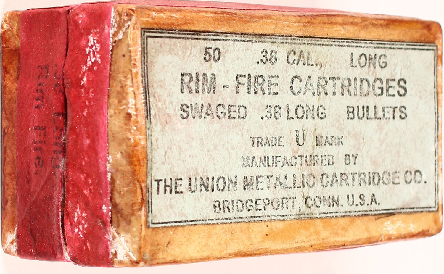 UMC, .38 Long Rim Fire, Full, 2pc. Buff box with (Reproduction) Blue top & red side sealing labels, box is solid with good color, box has been coated in lacquer, age soiling, color darkening from lacquer, minor edge & corner wear, side sealing label is intact, ammo is very good. Grade: Very Good - Value: 20 to 60