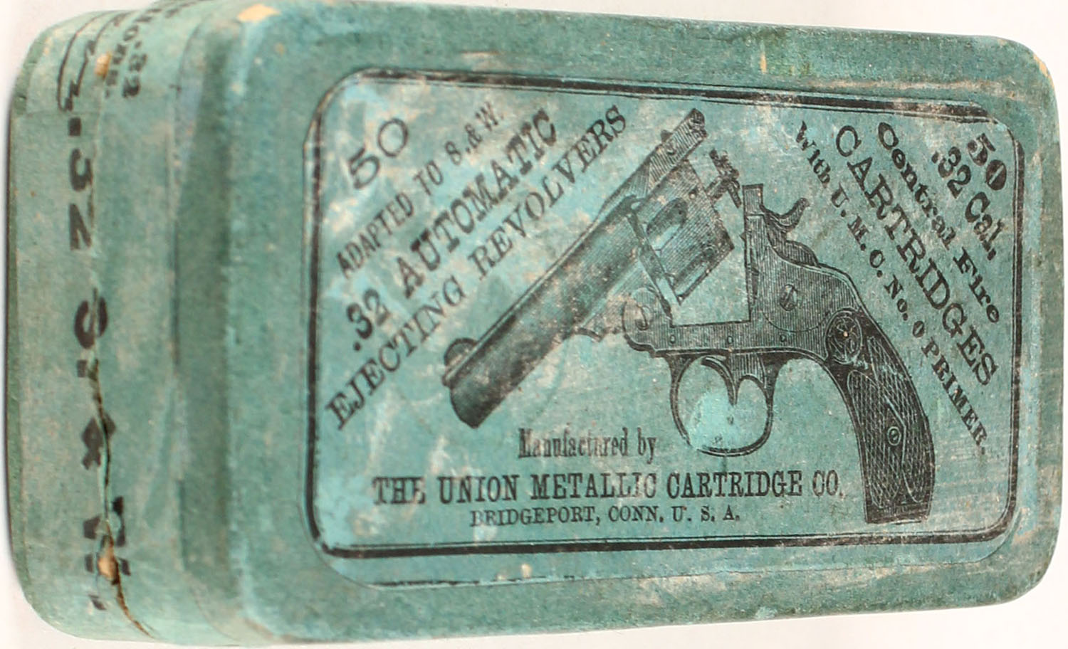 UMC, .32 Smith & Wesson Automatic, Full of incorrect ammo, 2pc. Blue box with blue top & side sealing labels, box is solid with very good color, minor age soiling, some shelf wear, corners are mostly sharp, edges are mostly crisp, side sealing label is 90% intact, ammo is very good. Grade: Excellent - Value: 10 to 50