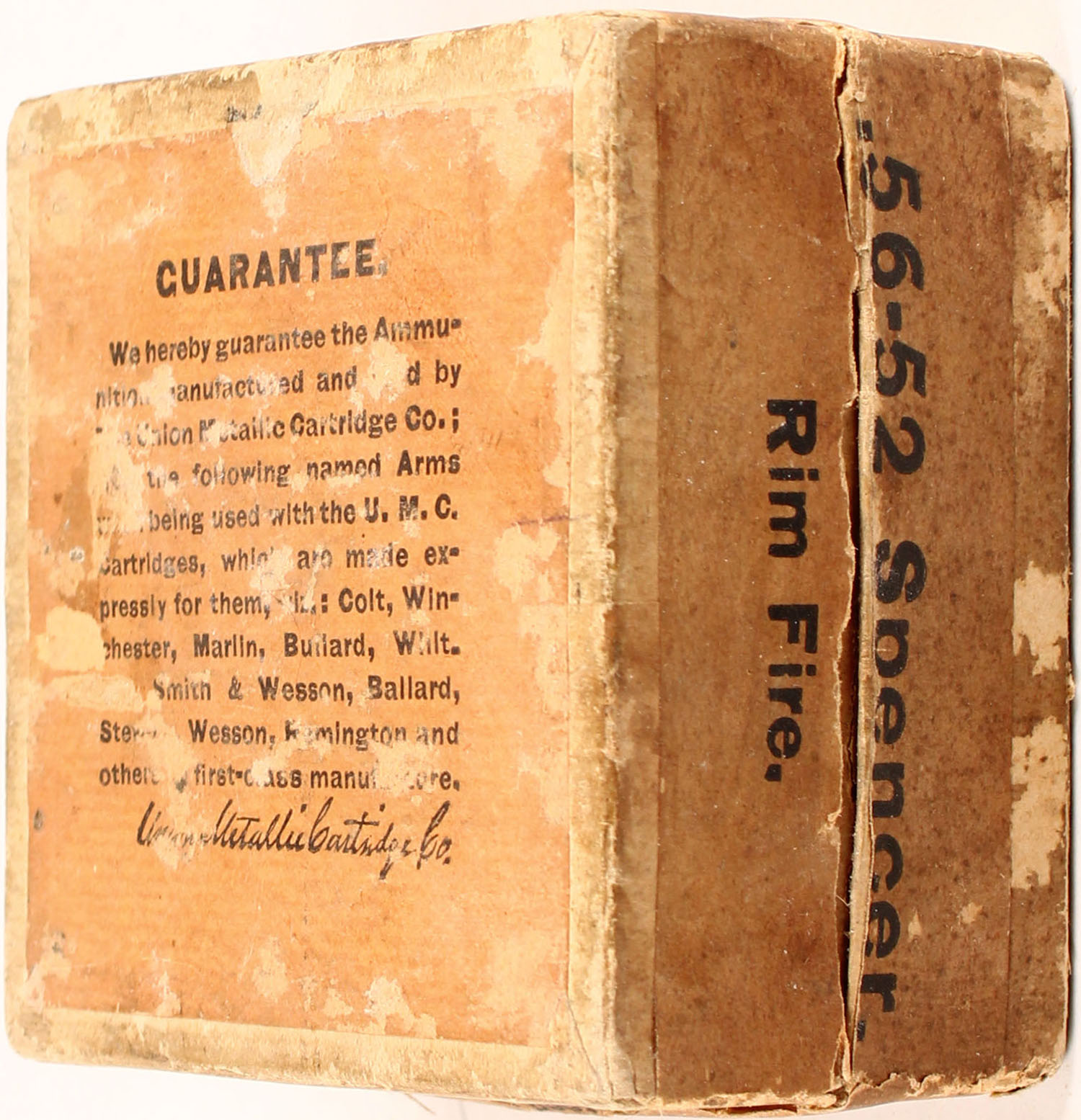UMC, 56-52 Spencer, Rim-Fire Cartridges, Full, 2pc. Buff box with buff top & side sealing labels, box is solid with good to very good color, age soiling, shelf wear, some edge & corner wear, side sealing label is 99% intact, ammo is very good to excellent. Grade: Excellent + - Value: 200 to 600