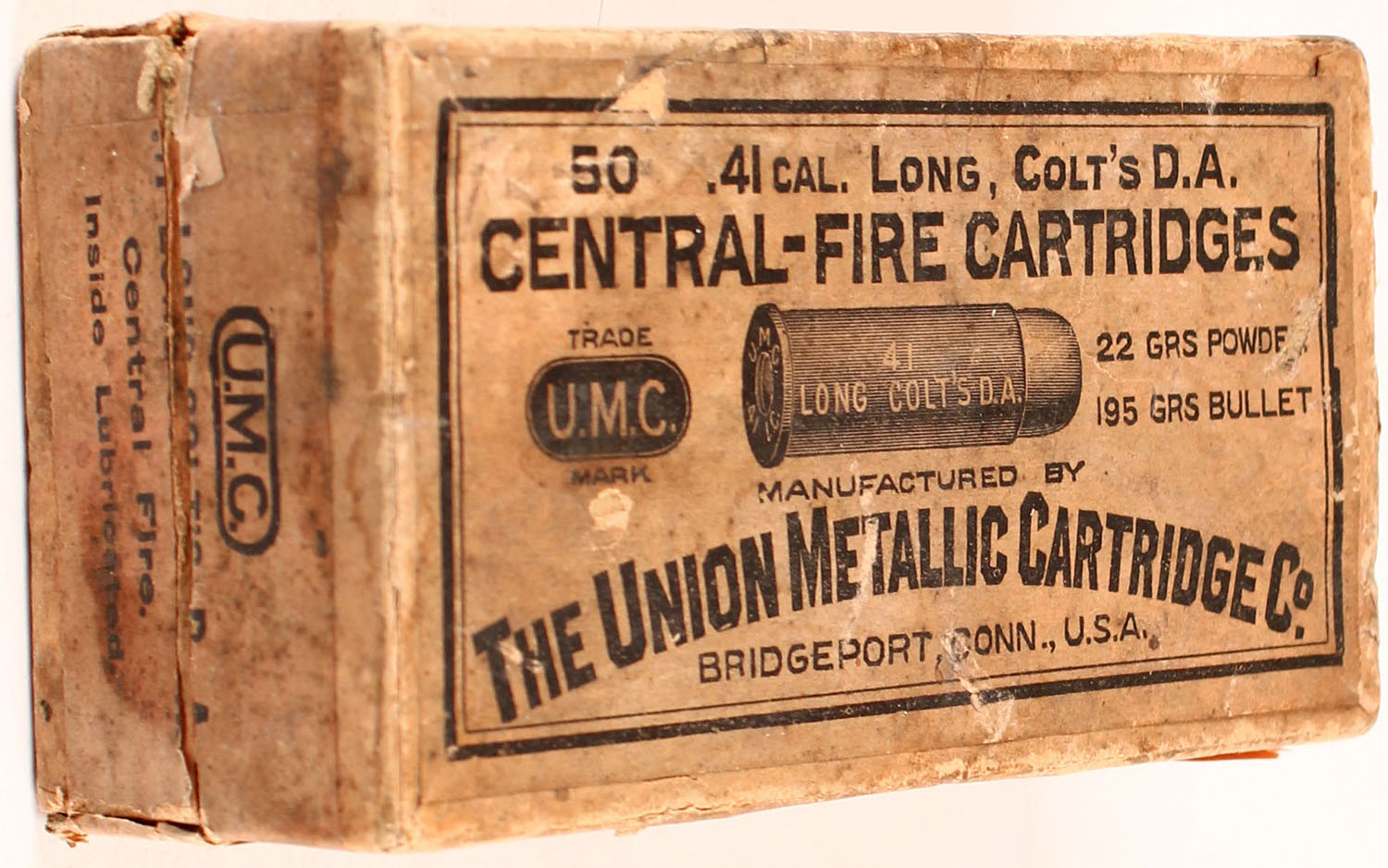 UMC, .41 Long Colt, 22 Grs. Powder, 195 Grs. Bullet, Partial 48rds., 2pc. Buff box with buff top & side sealing labels, box is solid with very good color, some age soiling & shelf wear, minor edge & corner wear, partial seam split to bottom front edge, labels are intact, ammo is very good to excellent. Grade: Very Good + - Value: 30 to 90