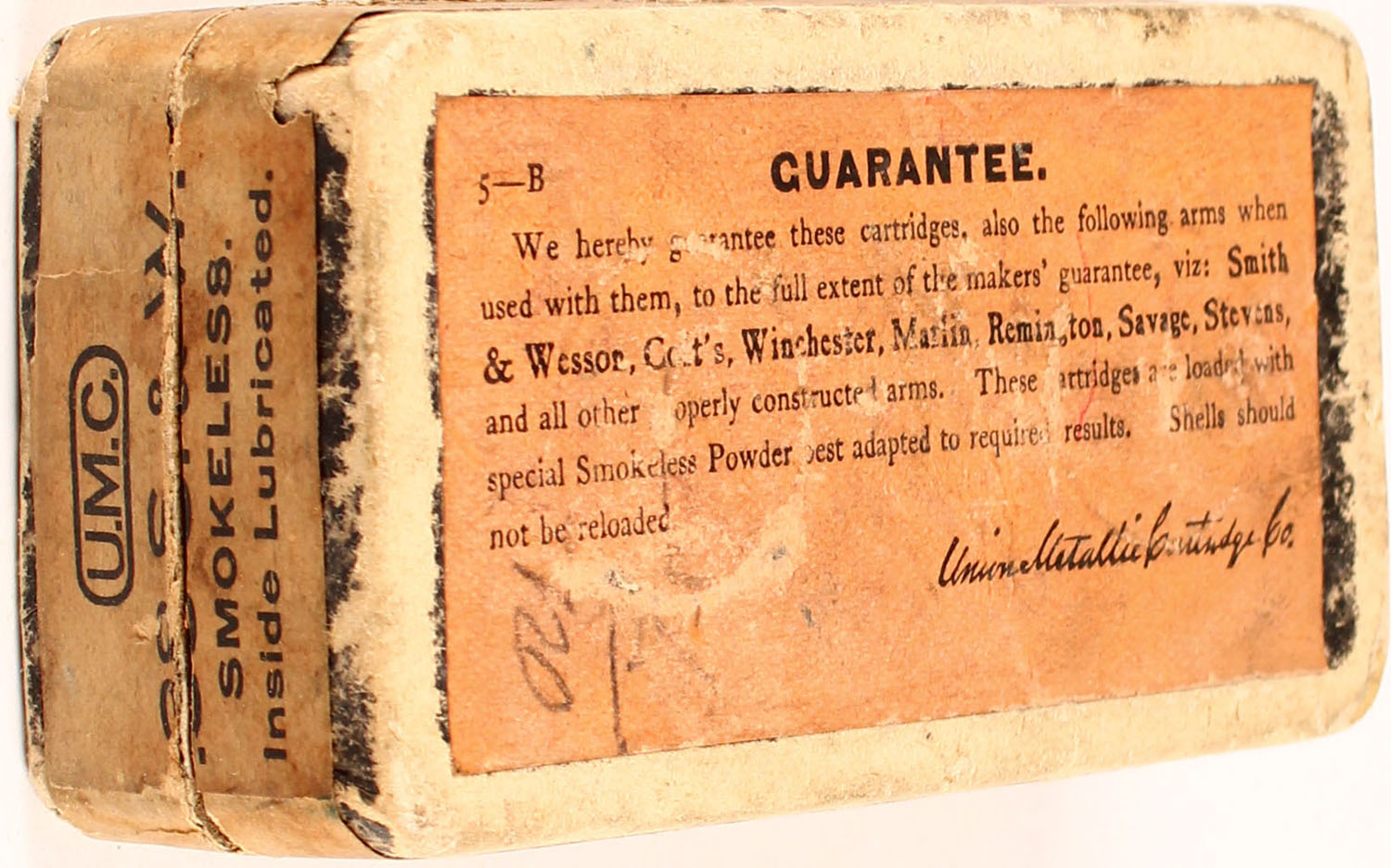 UMC, .38 Smith & Wesson, Smokeless, Full, 2pc. Buff box with buff top & side sealing labels, box is solid with good to very good color, age soiling, shelf wear, some staining to top, edge & corner wear, labels are intact, ammo is excellent. (126) Grade: Very Good ++ - Value: 10 to 90