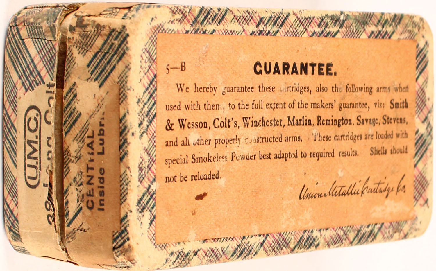 UMC, .38 Long Colt, Smokeless, Full, 2pc. Fabric box with buff top & side sealing labels, box is solid with very good color, some age soiling & shelf wear, minor edge & corner wear, side sealing label is 40% intact, ammo is very good. (564) Grade: Very Good ++ - Value: 30 to 90