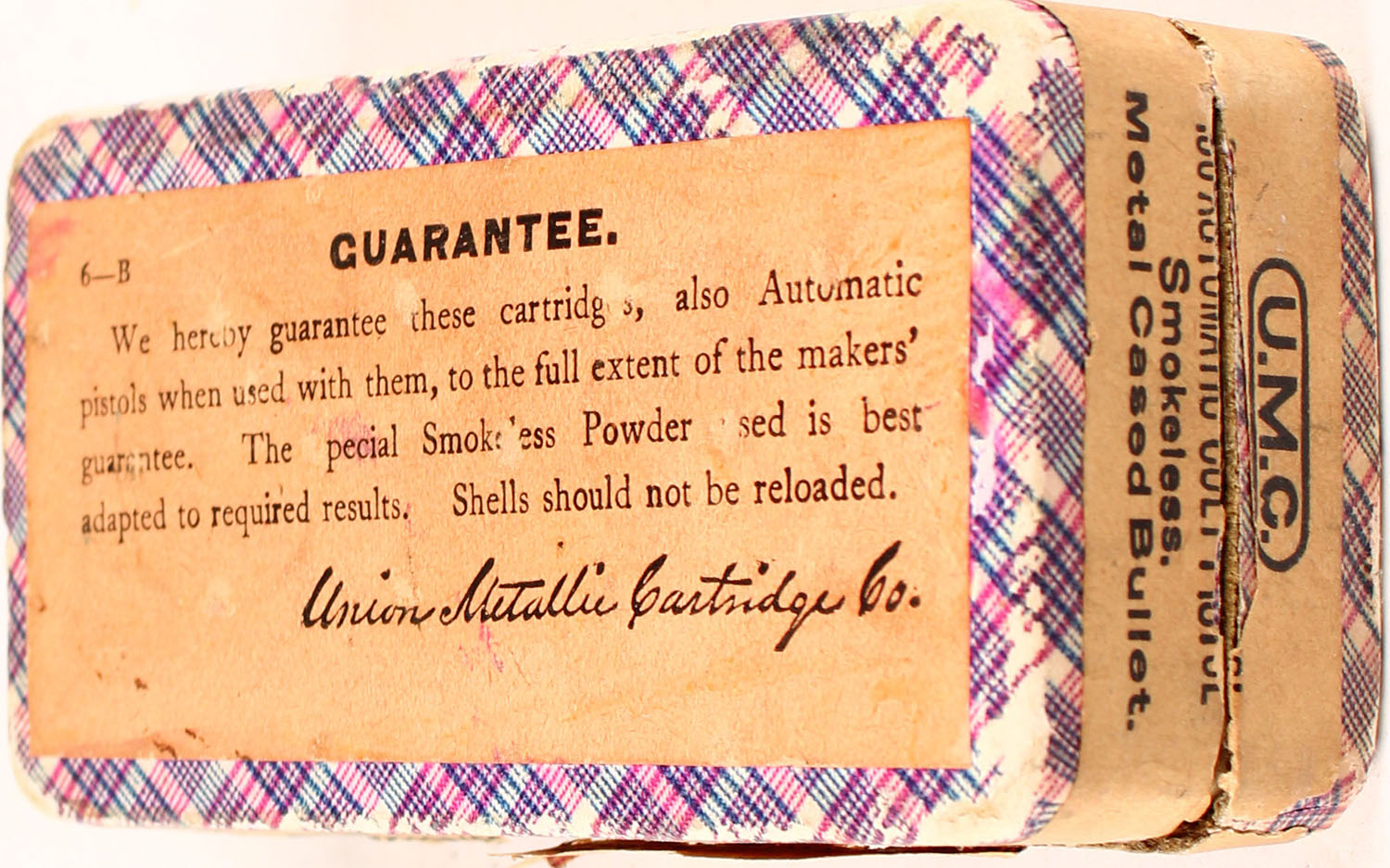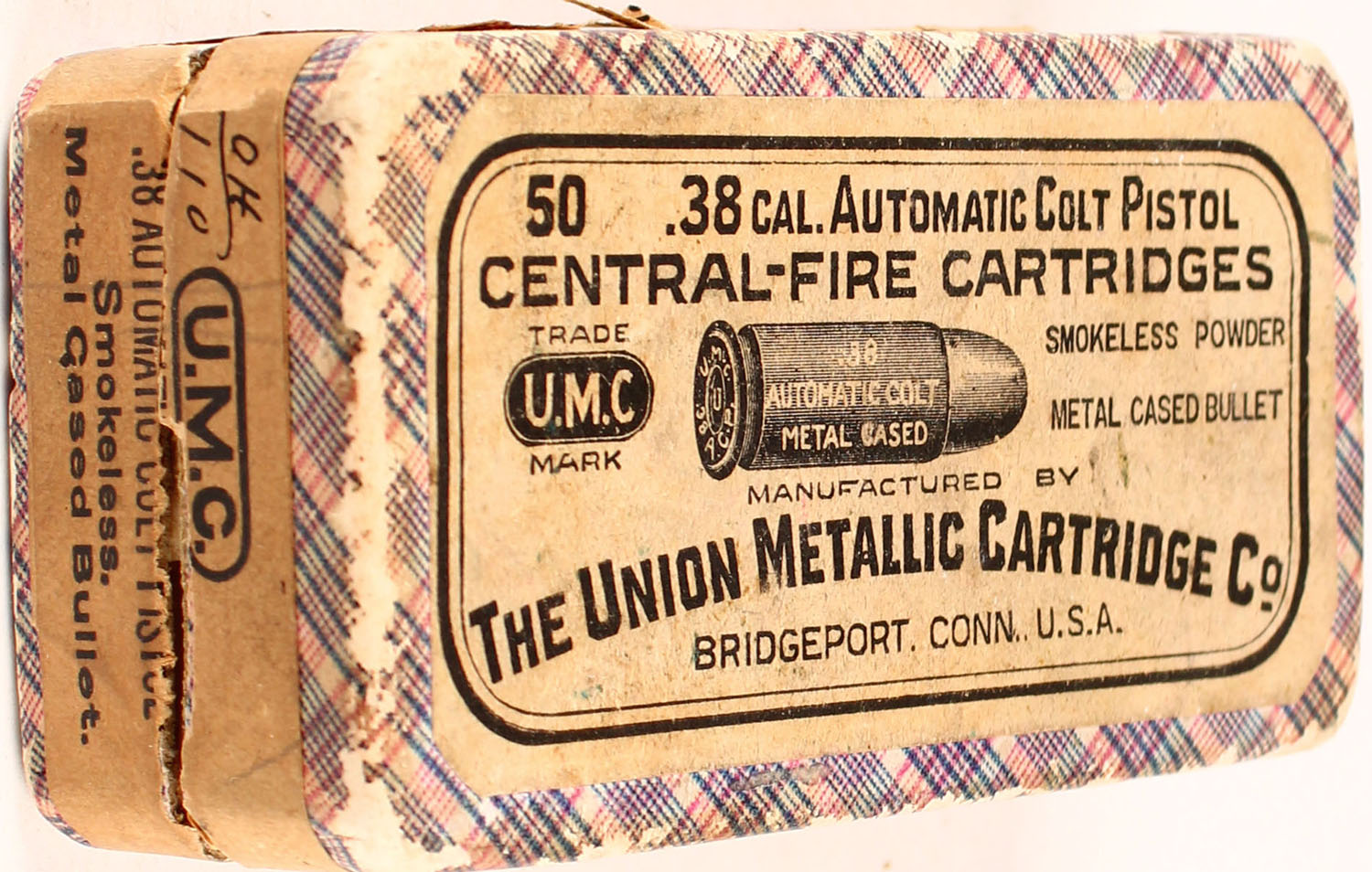 UMC, .38 Automatic Colt Pistol, Smokeless Powder, Metal Cased Bullet, Full, 2pc. Purple fabric box with buff top & side sealing labels, box is solid with excellent color, minor age soiling, some edge & corner wear, side sealing label is 80% intact, ammo is excellent. Grade: Excellent + - Value: 50 to 150