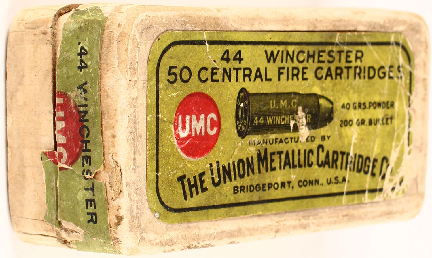 UMC, .44 Winchester, 40 Grs. Powder, 200 Gr. Bullet, Full, 2pc. Buff box with green top & side sealing labels, box is solid with very good color, age soiling, some shelf wear, edge & corner wear, side sealing label is 10% intact, ammo is very good to excellent. Grade: Very Good ++ - Value: 20 to 150