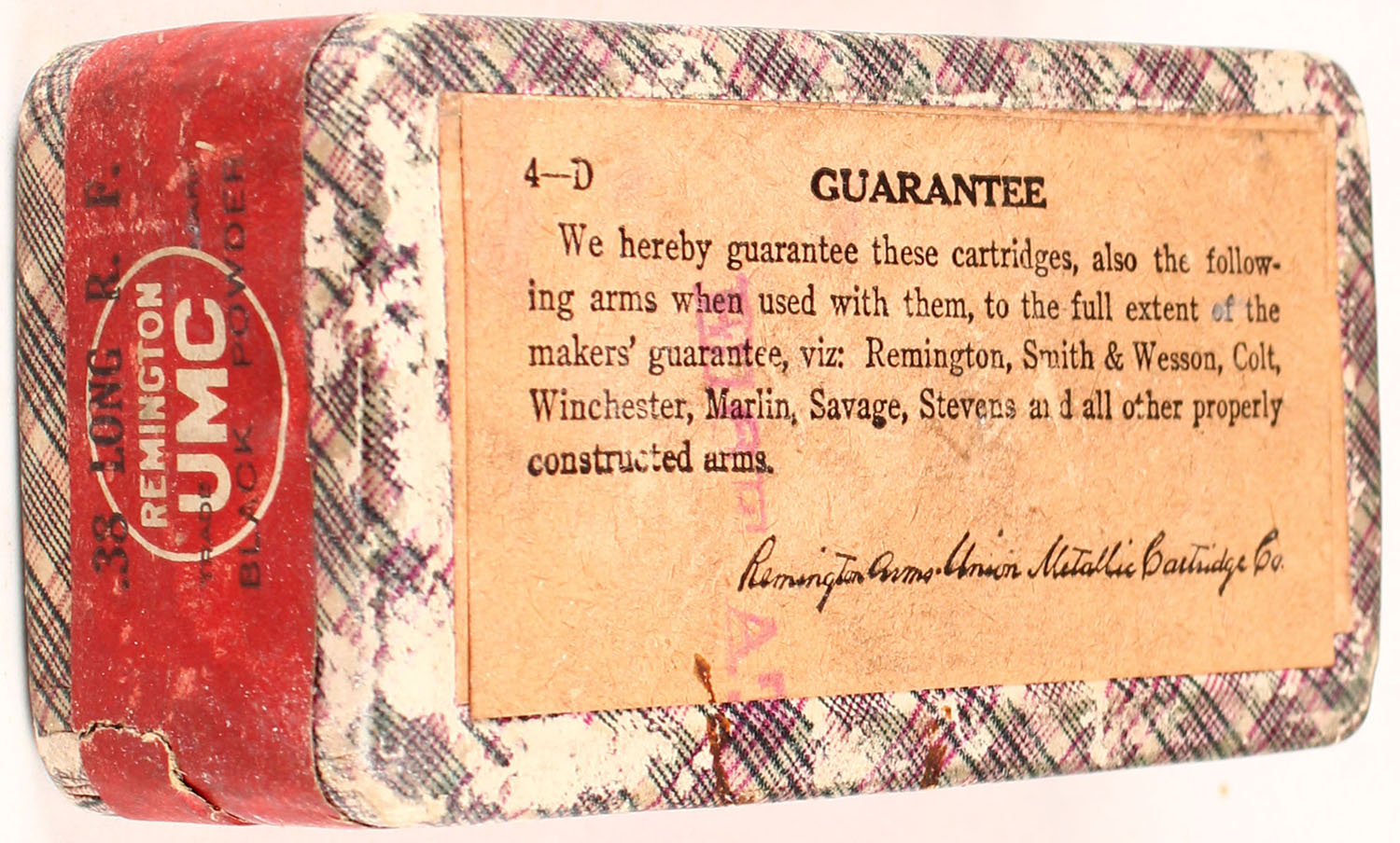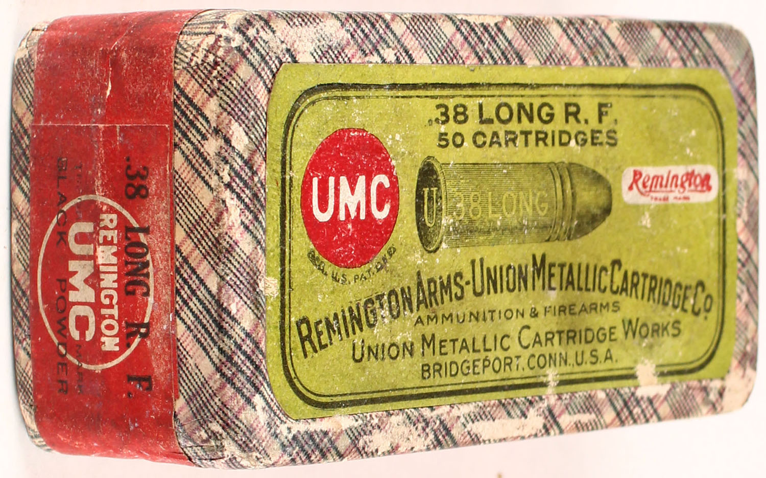 REM-UMC, 38 Long Rim Fire, Black Powder, FULL & SEALED, 2pc. Purple fabric box with green top & red side sealing labels, box is solid with very good to excellent color, minor age soiling & shelf wear, very minor corner wear, minor edge wear, labels are intact. Grade: Excellent + - Value: 50 to 150