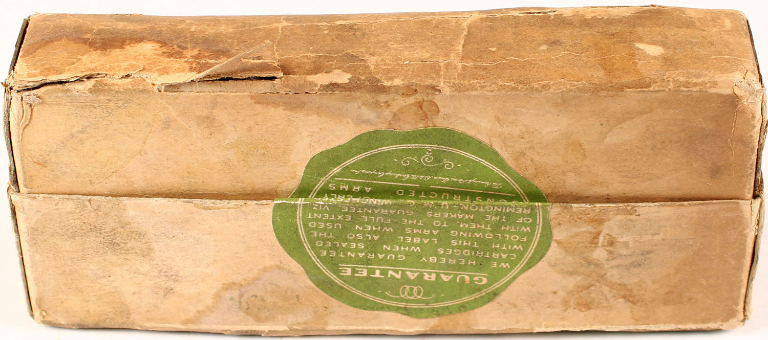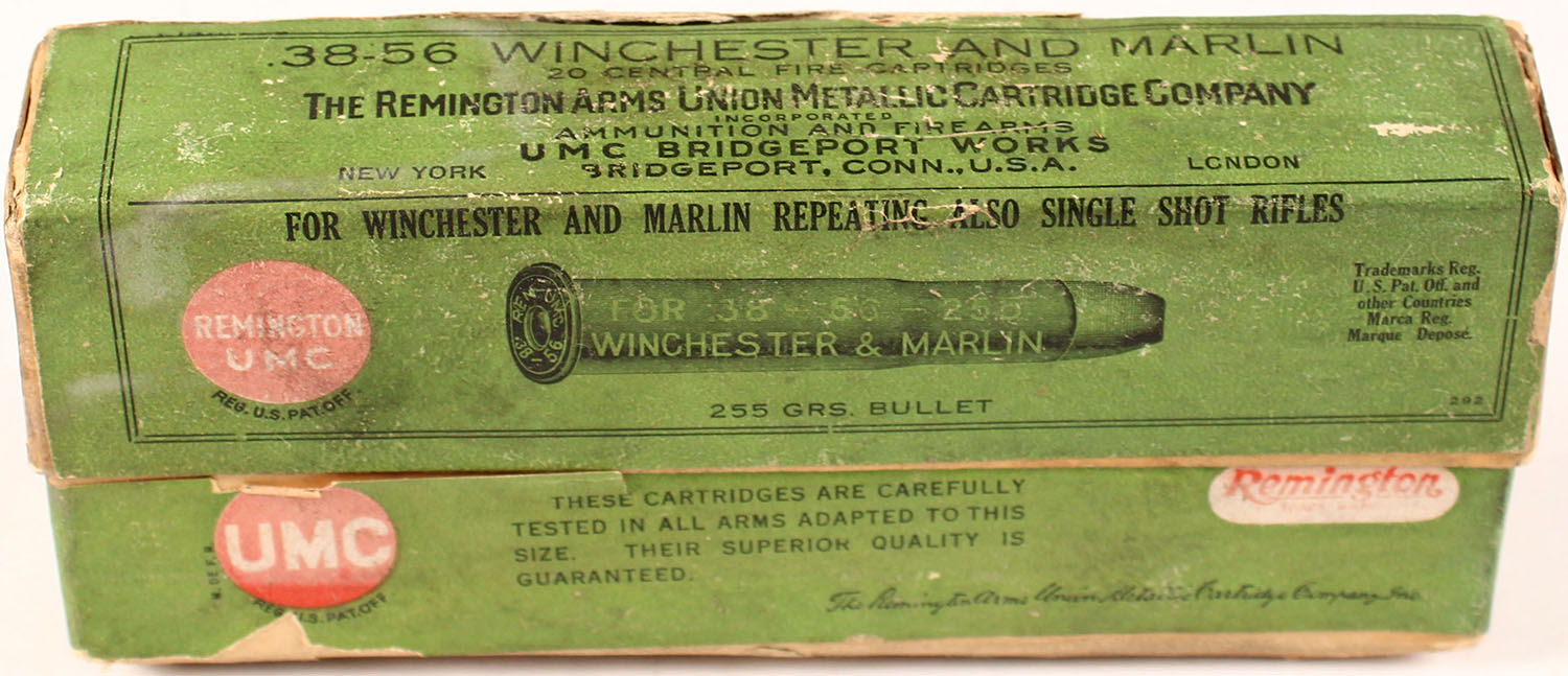 REM-UMC, 38-56 Winchester and Marlin, Black Powder, 255 Grs. Bullet, FULL & SEALED, 2pc. Buff box with green labels box is solid with very good color, some age soiling & shelf wear, minor color fading, seam split to back edge of lid, edges otherwise mostly crisp, minor corner wear, labels are intact. Grade: Very Good ++ - Value: 100 to 300