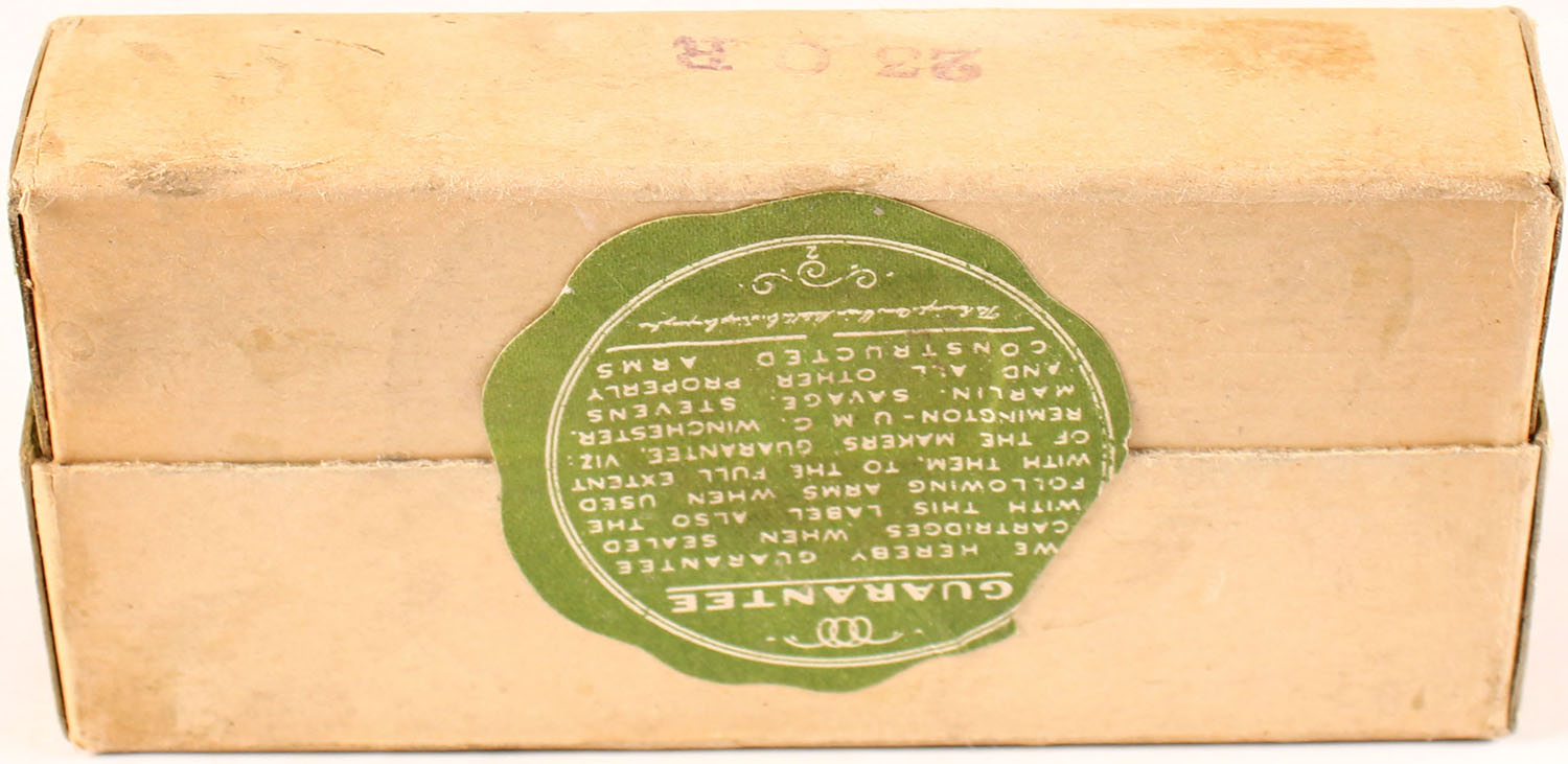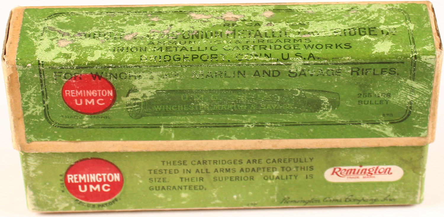 REM-UMC, 38-55 Winchester, Black Powder, 255 Grs. Bullet, FULL & SEALED, 2pc. Buff box with green labels, box is solid with very good to excellent color, shelf wear, very minor corner wear, edges are mostly crisp, labels are intact. Grade: Excellent - Value: 20 to 150