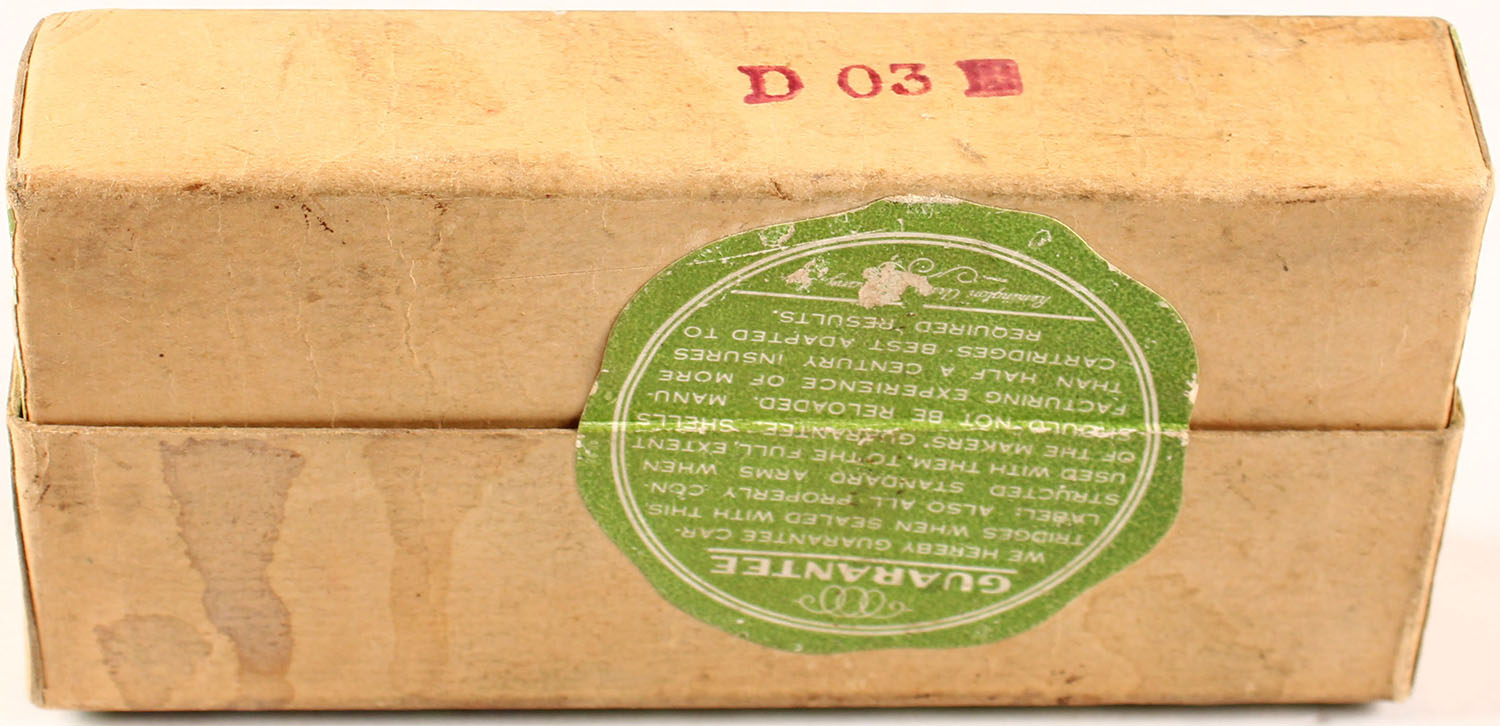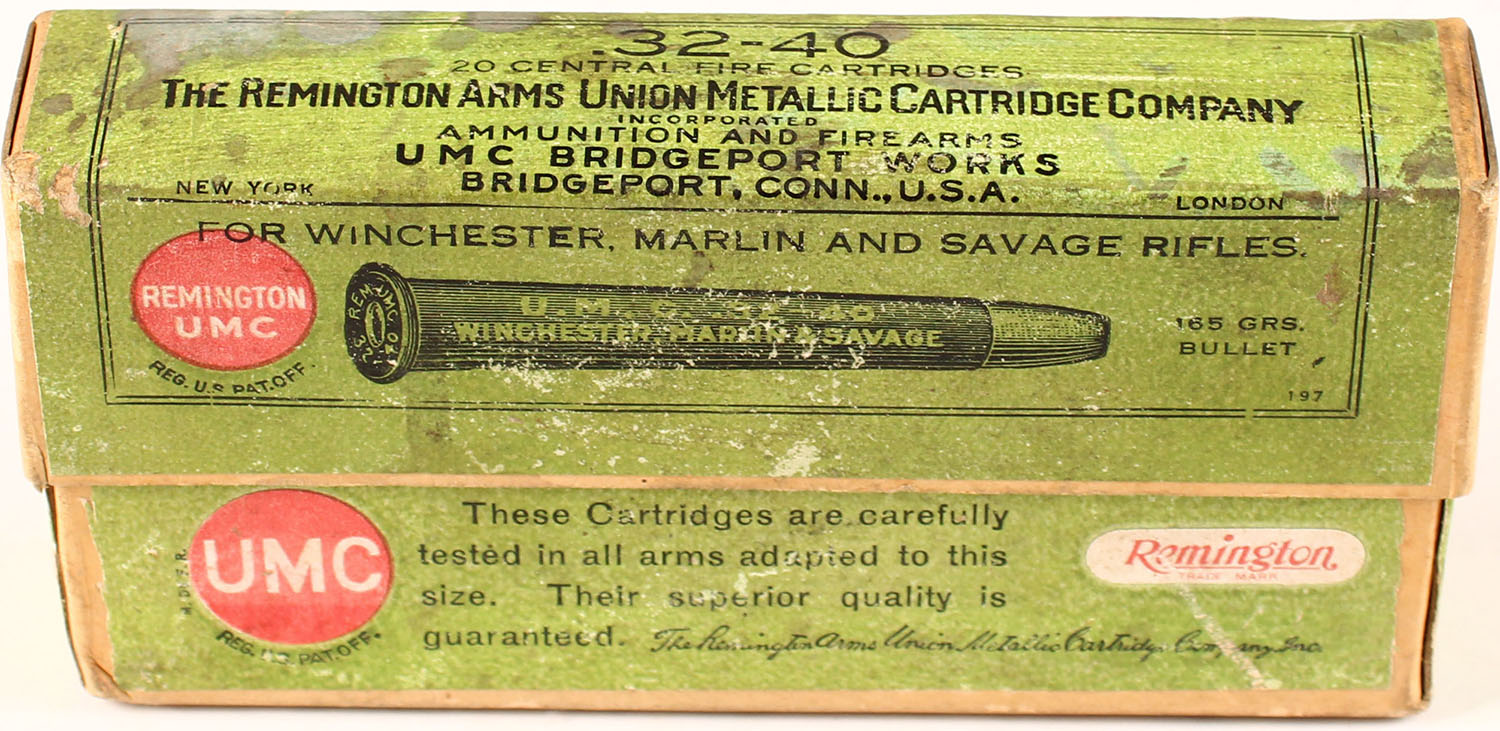 REM-UMC, .32-40 Winchester and Savage, 165 Grs. Bullet, FULL & SEALED, 2pc. Buff box with green labels, box is solid with very good color, minor age soiling & shelf wear, very minor color fading, some staining to top and back side, very minor corner wear, edges are crisp, labels are intact. Grade: Excellent - Value: 50 to 300