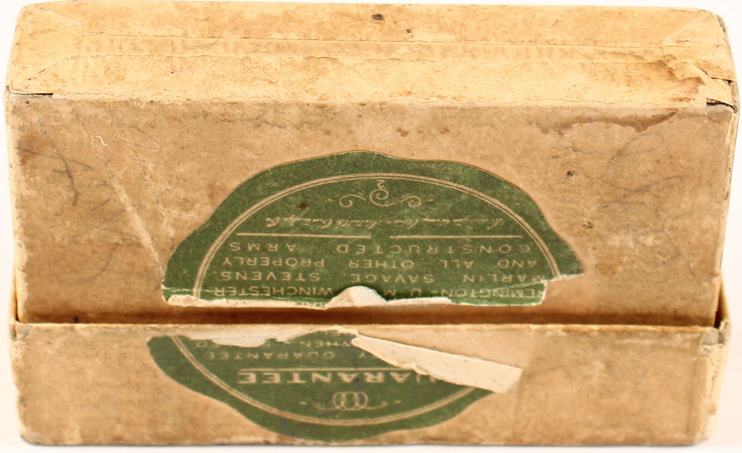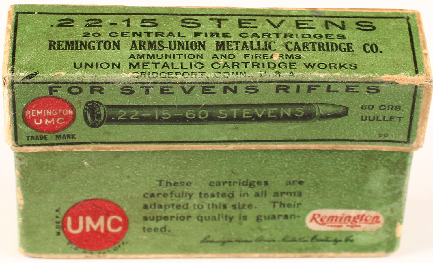 REM-UMC, .22-15 Stevens, Black Powder, 60 Grs. Bullet, Partial 7rds. 2pc. Buff box with green labels, box is solid with excellent color, minor age soiling, very minor edge & corner wear, labels are intact, ammo is excellent. Grade: Excellent + - Value: 20 to 60