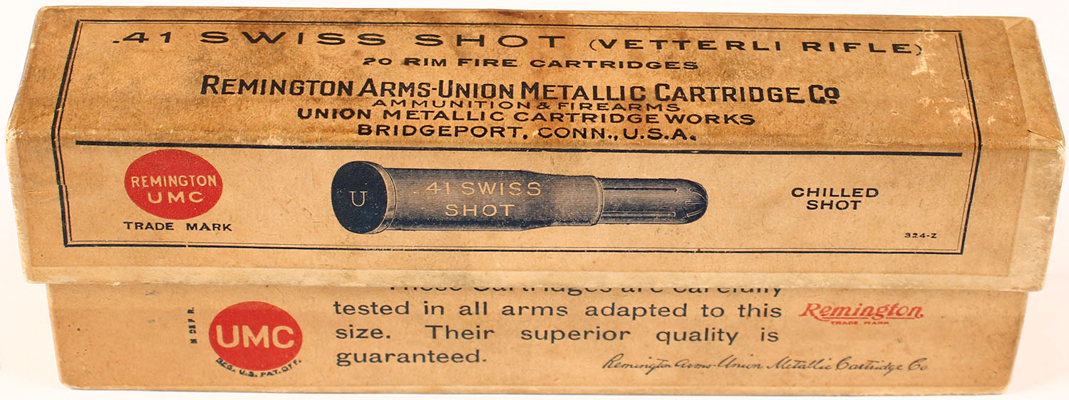 REM-UMC, .41 Swiss Shot, (Vetterli Rifle), Smokeless Powder, Chilled Shot, Full, 2pc. Buff box with buff labels, box is solid with very good color, some age soiling, very minor shelf & corner wear, edges are crisp, labels are intact, ammo is very good. Grade: Excellent + - Value: 30 to 90