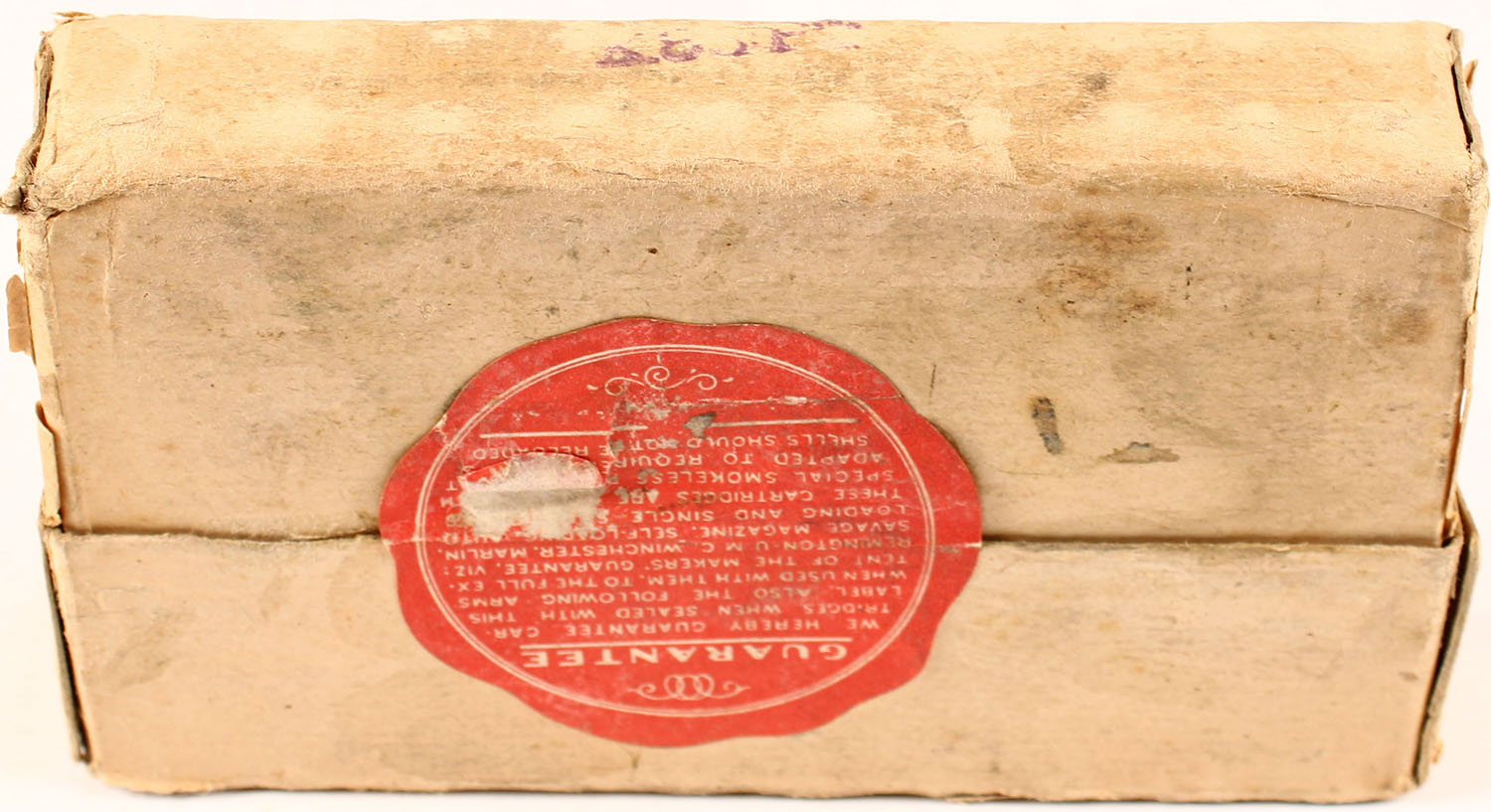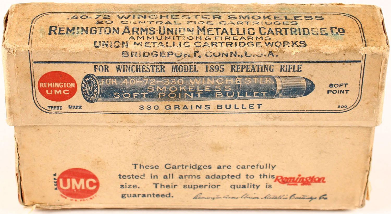 REM-UMC, 40-72 Winchester, Smokeless Powder, 330 Grain Soft Point Bullet, FULL & SEALED, 2pc. Buff box with buff labels, box is solid with excellent color, some age soiling, some edge & corner wear, staining to top, partial seam split to back edge of lid, labels are intact. Grade: Very Good ++ - Value: 100 to 300