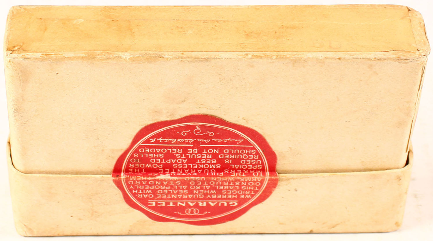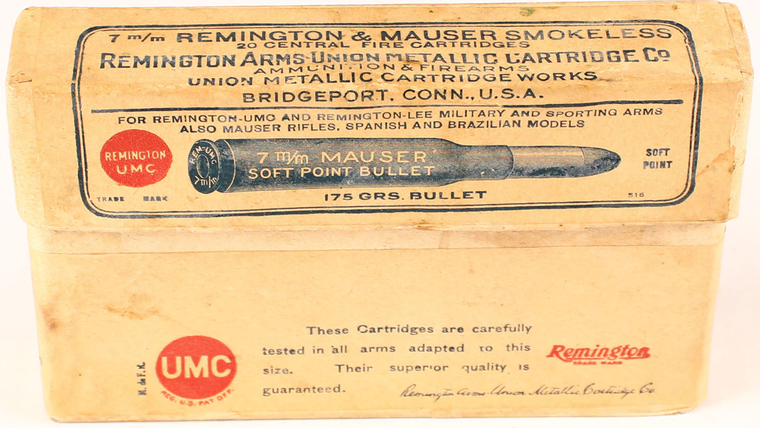 REM-UMC, 7mm Mauser, Smokeless Powder, 175 Grain Soft Point Bullet, FULL & SEALED, 2pc. Buff box with buff labels, box is solid with excellent color, minor age soiling, very minor corner wear, edges are mostly crisp, labels are intact. Grade: Excellent + - Value: 50 to 150