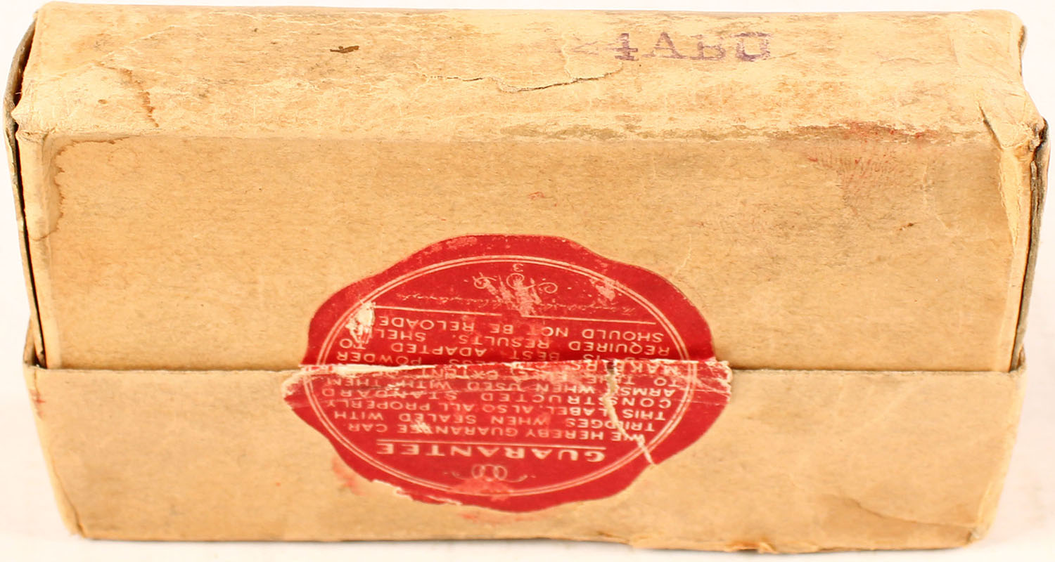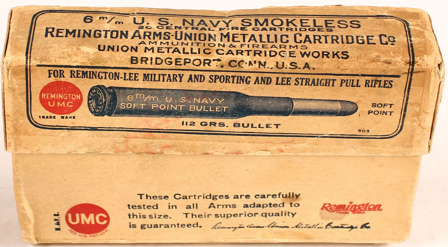 REM-UMC, 6mm U.S. Navy, Smokeless Powder, 112 Grain Soft Point Bullet, Full, 2pc. Buff box with buff labels, box is solid with very good to excellent color, some age soiling, minor staining to front, some corner & edge wear, labels are intact, ammo is very good to excellent. Grade: Excellent - Value: 30 to 90