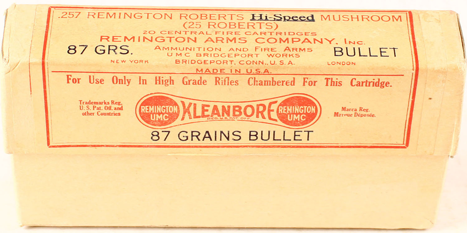 REM-UMC, Kleanbore Hi-Speed, .257 Remington Roberts (25 Roberts), 87 Grain Mushroom Bullet, Full, 2pc. Buff box with buff dog bone label, box is solid with excellent color, only very minor age soiling, minor corner wear, edges are mostly crisp, label is intact, ammo is very good to excellent. Grade: Excellent + - Value: 30 to 90