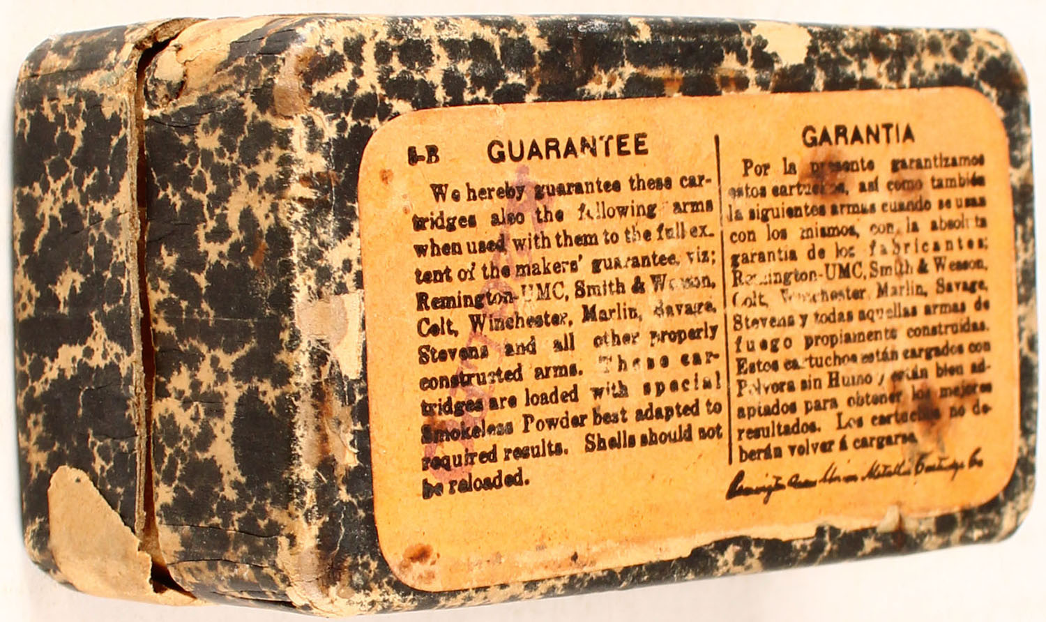 REM-UMC, .38 Special, Smokeless Powder, 158 Grain Bullet, Full, 2pc. Black mottled box with buff top & side sealing labels, box is solid with excellent color, minor age soiling, very minor shelf & corner wear, edges are crisp, side sealing label is 50% intact, ammo is excellent. Grade: Excellent + - Value: 30 to 90