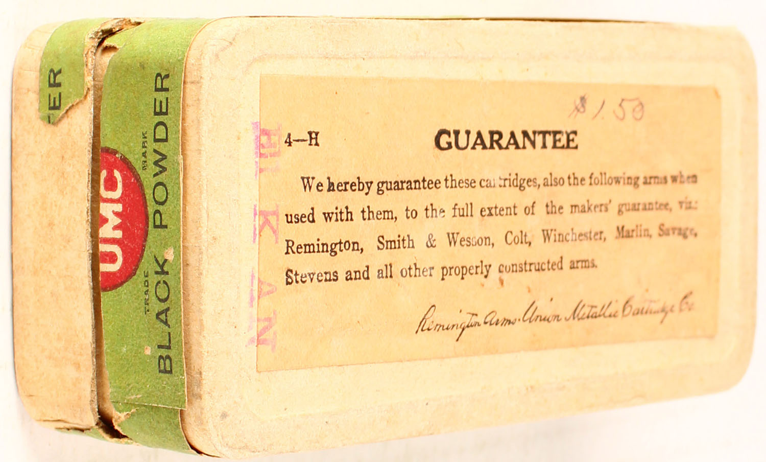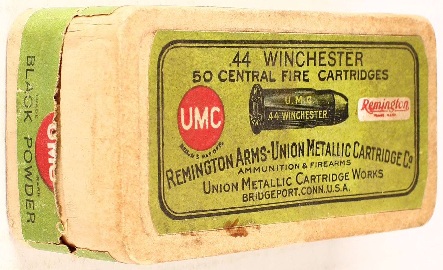 REM-UMC, .44 Winchester, Black Powder, Full, 2pc. Buff box with green top & side sealing labels, box is solid with very good to excellent color, some age soiling, very minor corner wear, edges are mostly crisp, bottom has been written on, side sealing label is 95% intact, ammo is excellent. Grade: Excellent - Value: 50 to 150
