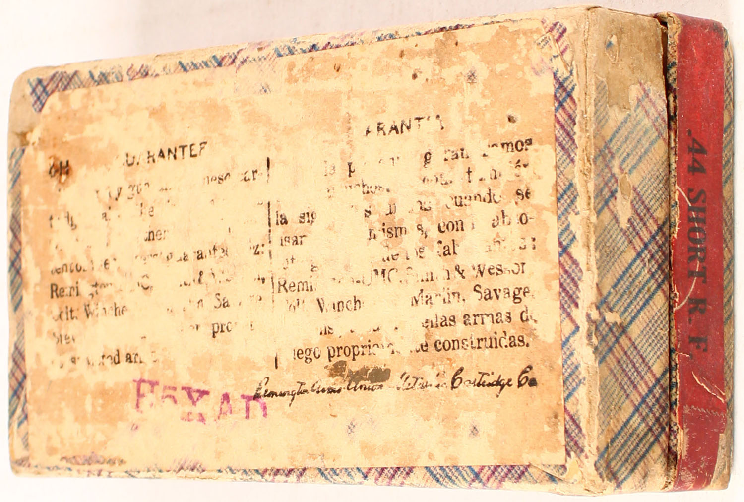REM-UMC, .44 Short Rim Fire, Black Powder, 200 Grain Bullet, Partial 48rds., 2pc. Blue fabric box with green top & red side sealing labels, box is solid with very good color, some age soiling & shelf wear, some corner & edge wear, top has been written on, side sealing label is 50% intact, ammo is very good. Grade: Very Good + - Value: 70 to 200