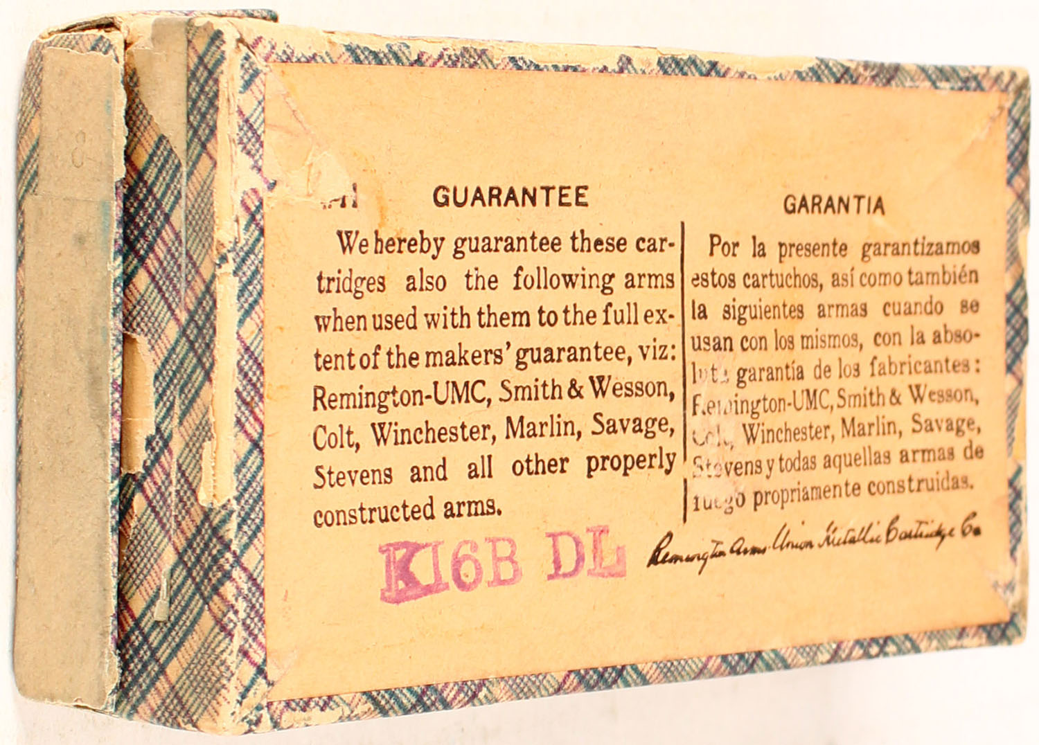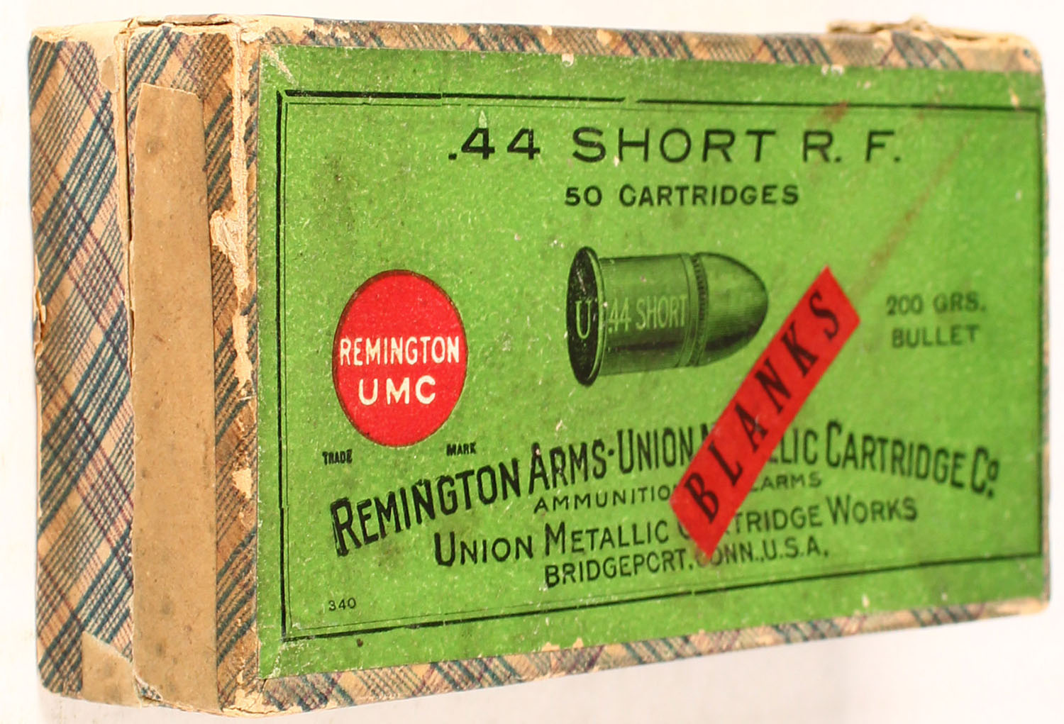 REM-UMC, .44 Rim Fire Blanks, Partial 46rds. 2pc. Blue fabric box with green top label, side sealing label is gone, box is solid with excellent color, very minor age soiling, minor edge & corner wear, repaired vertical seam splits to all 4 corners of lid, top label is intact, ammo is excellent. Grade: Very Good + - Value: 50 to 150