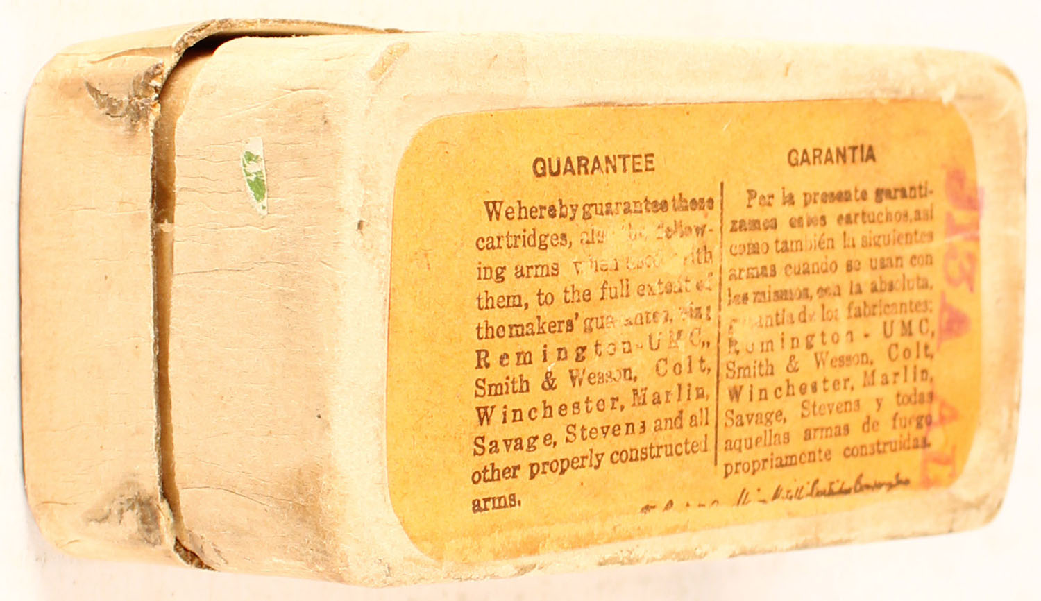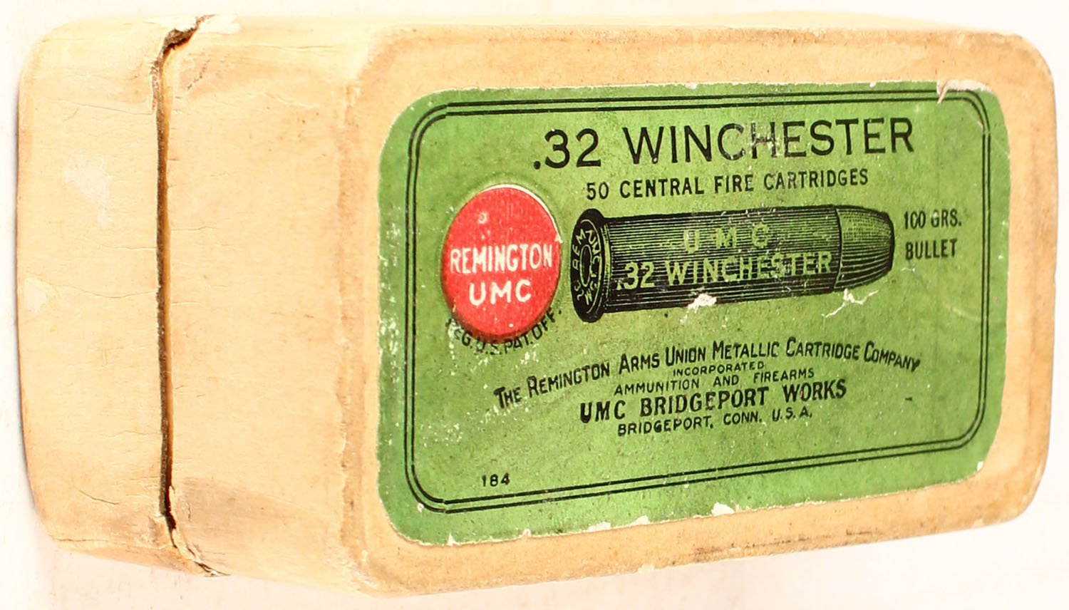 REM-UMC, .32 Winchester, 100 Grs. Bullet, Full of UMC H/S Hollow Point, 2pc. Buff box with green top label, side sealing label is gone, box is solid with excellent color, very minor age soiling & shelf wear, very minor edge & corner wear, very minor staining, ammo is excellent. Grade: Very Good ++ - Value: 10 to 40