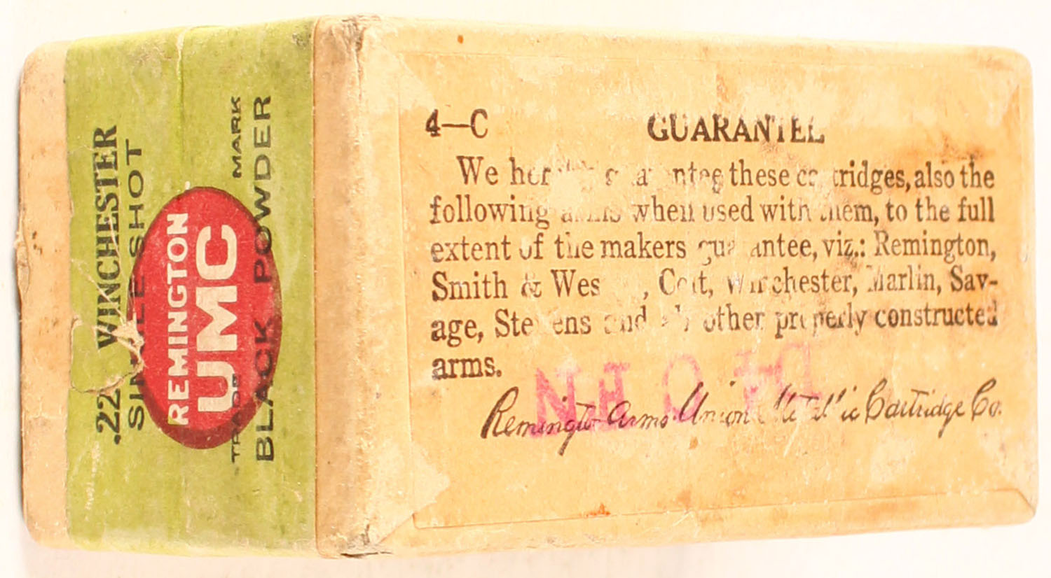 REM-UMC, .22 Winchester, Black Powder, FULL & SEALED, 2pc. Buff box with green top & side sealing labels, box is solid with excellent color, minor color fading & shelf wear, very minor corner wear, edges are mostly crisp, labels are intact. Grade: Excellent + - Value: 100 to 300