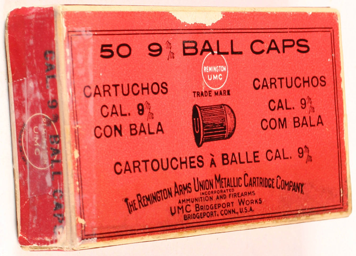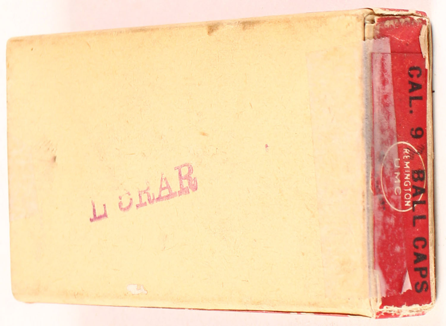 REM-UMC, 9mm Ball Caps, Rim Fire, Full, 1pc. Buff box with red top & side sealing labels, box is solid with excellent color, some age soiling left end flap is torn and taped, tape on right end flap, very minor edge & corner wear, ammo is very good to excellent. Grade: Excellent - Value: 30 to 90