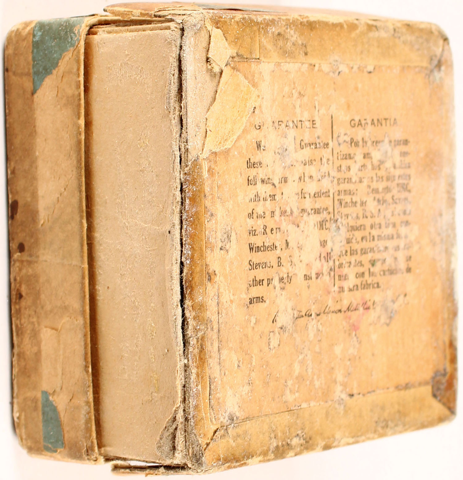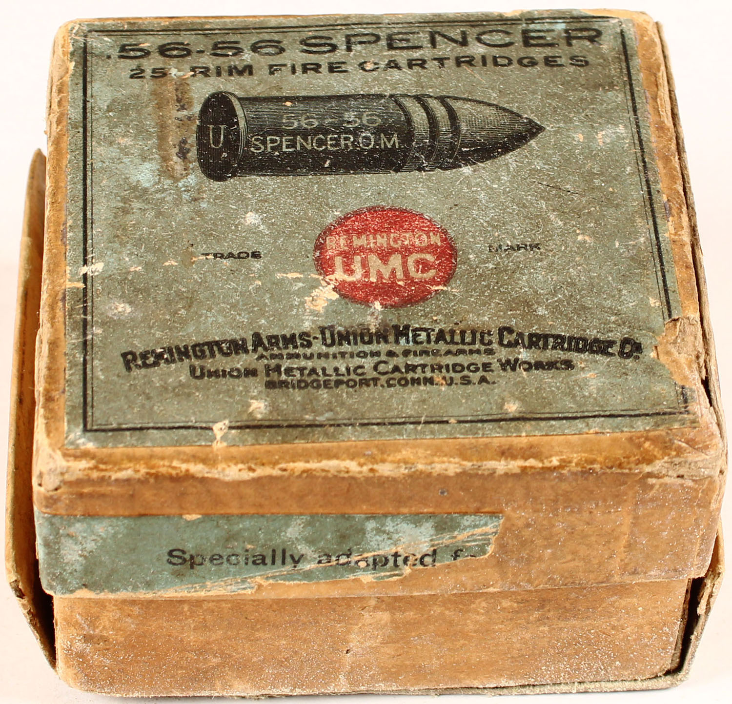 REM-UMC, .56-56 Spencer, Rim Fire Cartridges, Full, 2pc. Buff box with blue top & side sealing labels, bottom has been torn off, box has good color, age soiling, shelf wear, some edge & corner wear, side sealing label is 25% intact, ammo is good. Grade: Good ++ - Value: 50 to 150