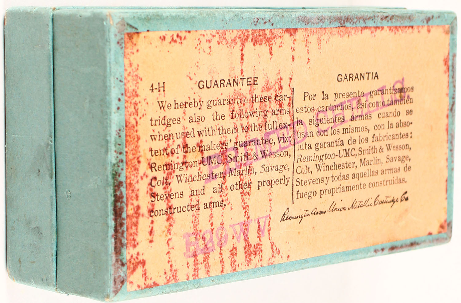 REM-UMC, .45 Smith & Wesson Schofield Model, Primed Shells, Full, 2pc. Blue box with blue top label & white ''Primed Shells'' Over-Label, box is solid with very good color, minor age soiling & shelf wear, minor corner wear, very minor edge wear, some staining, label is intact, ammo is excellent. Grade: Excellent - Value: 20 to 60