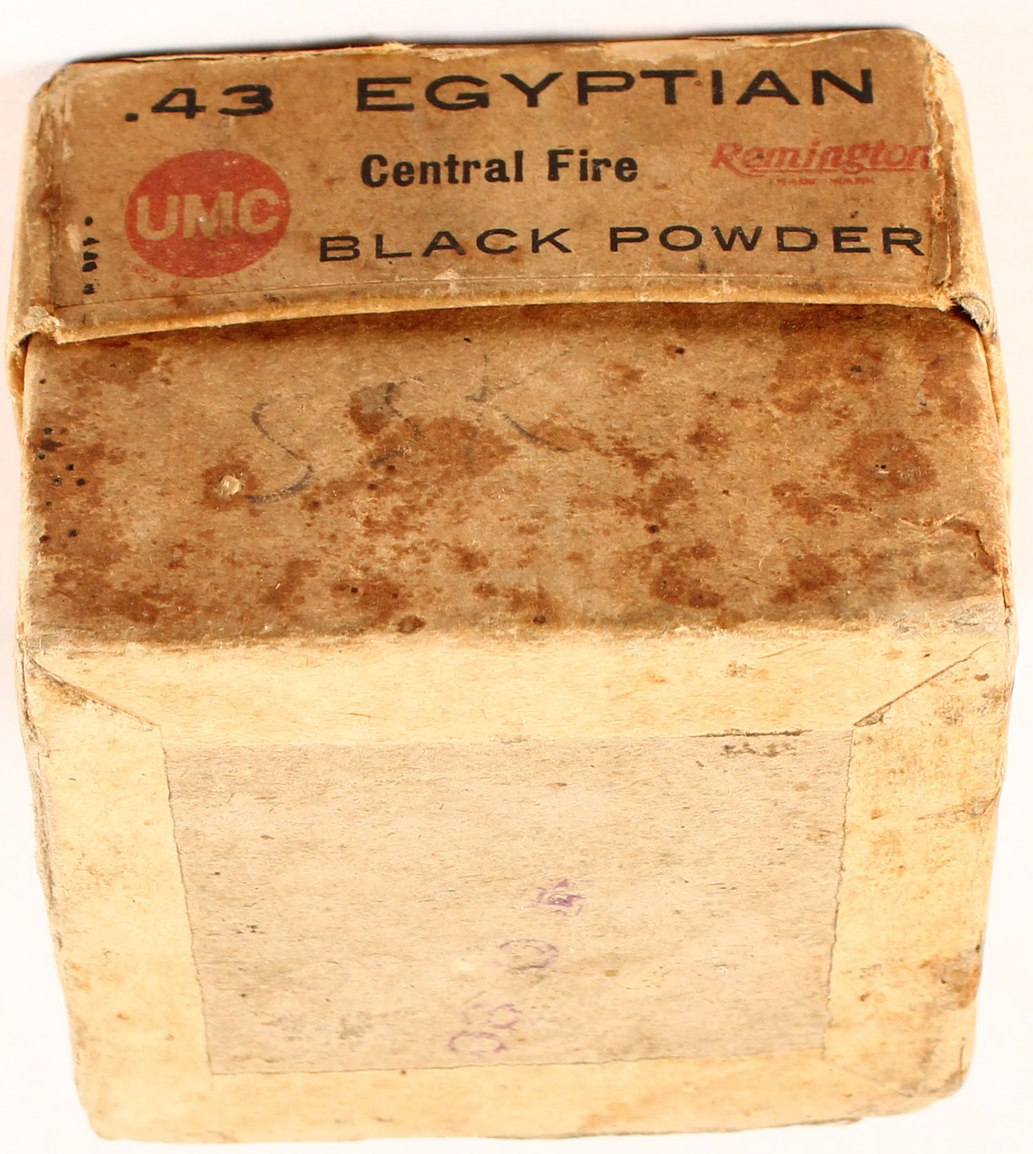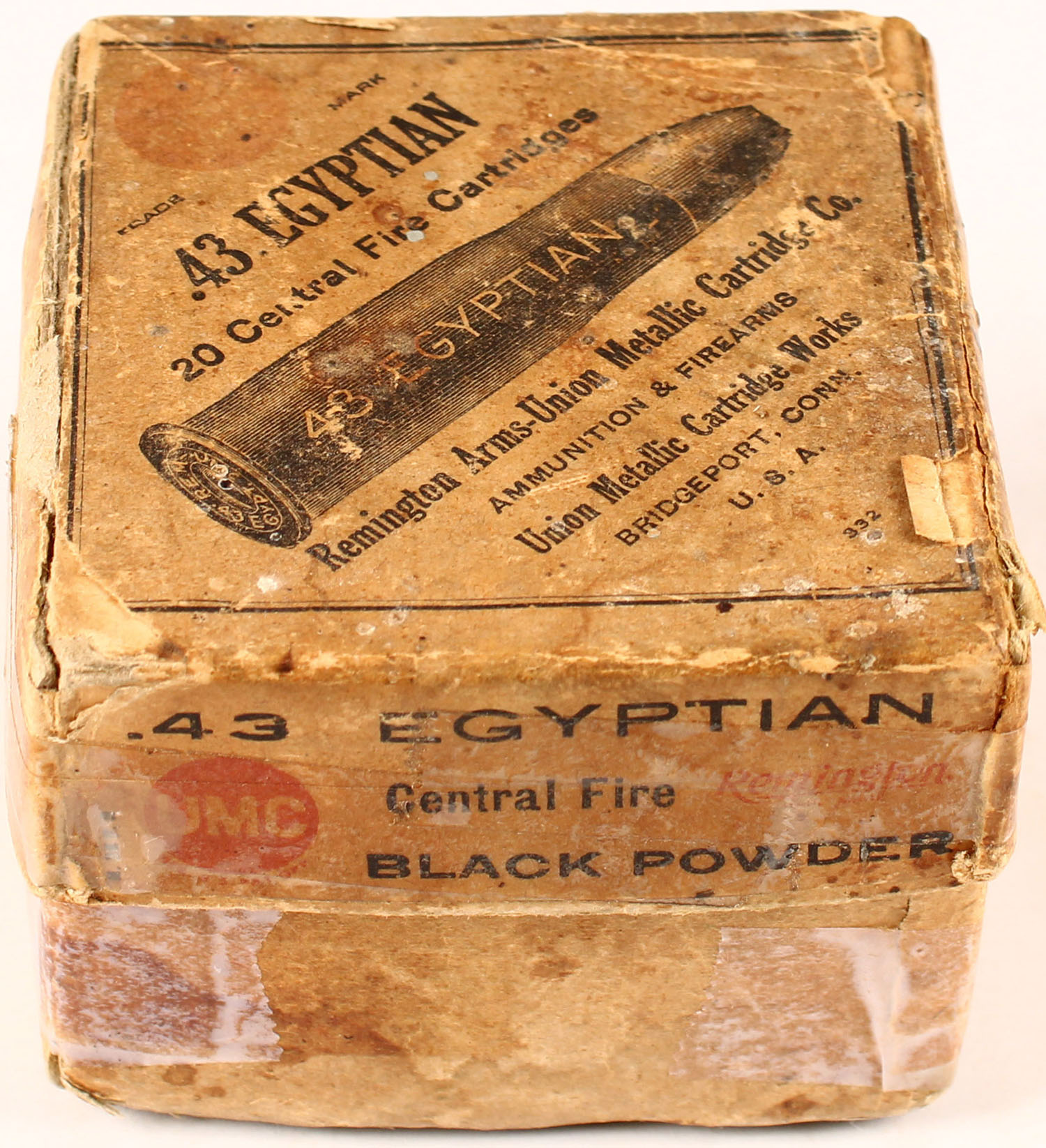 REM-UMC, .43 Egyptian, Black Powder, Central Fire Cartridges, Full, 2pc. Buff box with buff label, box has tape in several places including an entire panel on side of box base that has been torn off and taped back on, age soiling, shelf wear, edge & corner wear, ammo is very good to excellent. Grade: Good - Value: 50 to 150