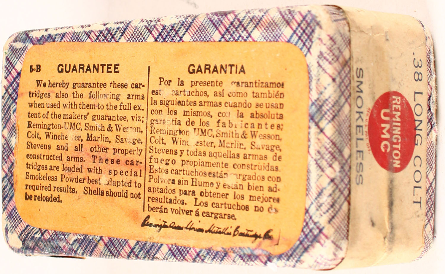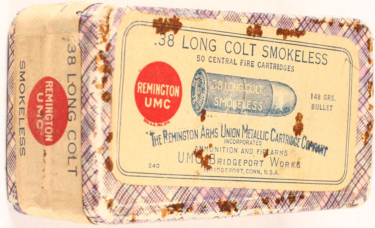 REM-UMC, .38 Long Colt, Smokeless, 148 Grain Bullet, FULL & SEALED, 2pc. Purple fabric box with buff top & side sealing labels, box is solid with excellent to minty color, some staining to top, minor edge & corner wear, labels are intact. Grade: Excellent + - Value: 50 to 150