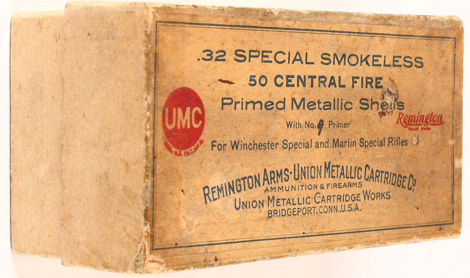 REM-UMC, .32 Special Smokeless, Primed Metallic Shells, Full, 2pc. Buff box with buff top label, box is solid with very good color, age soiling, minor edge & corner wear, very minor staining, shells are excellent. Grade: Excellent - Value: 20 to 60