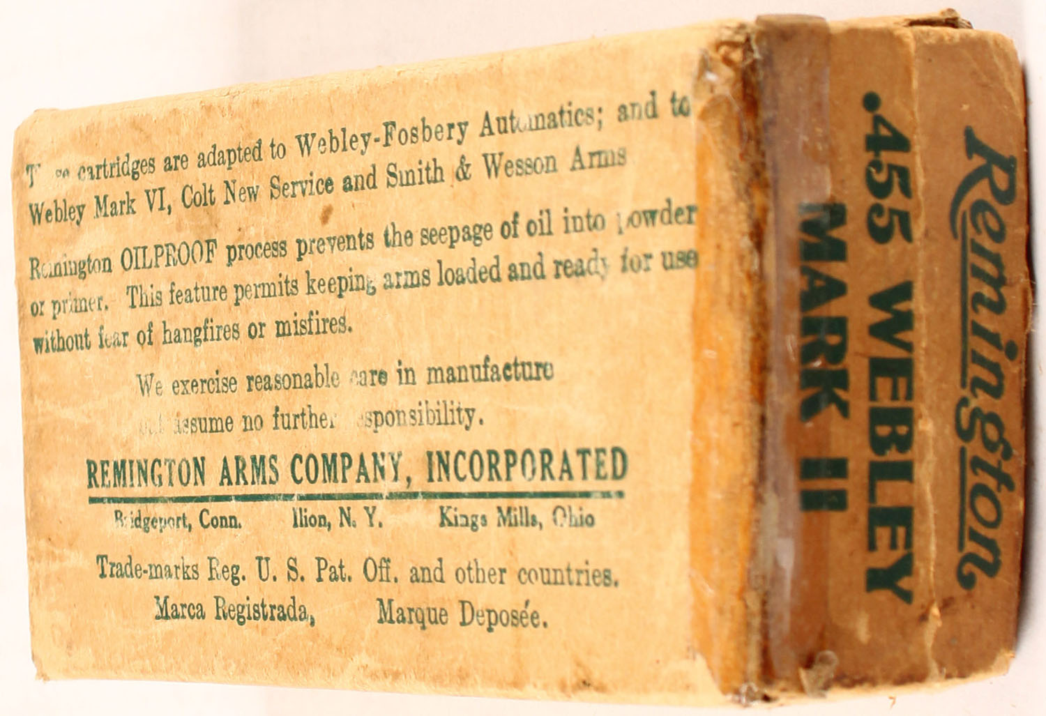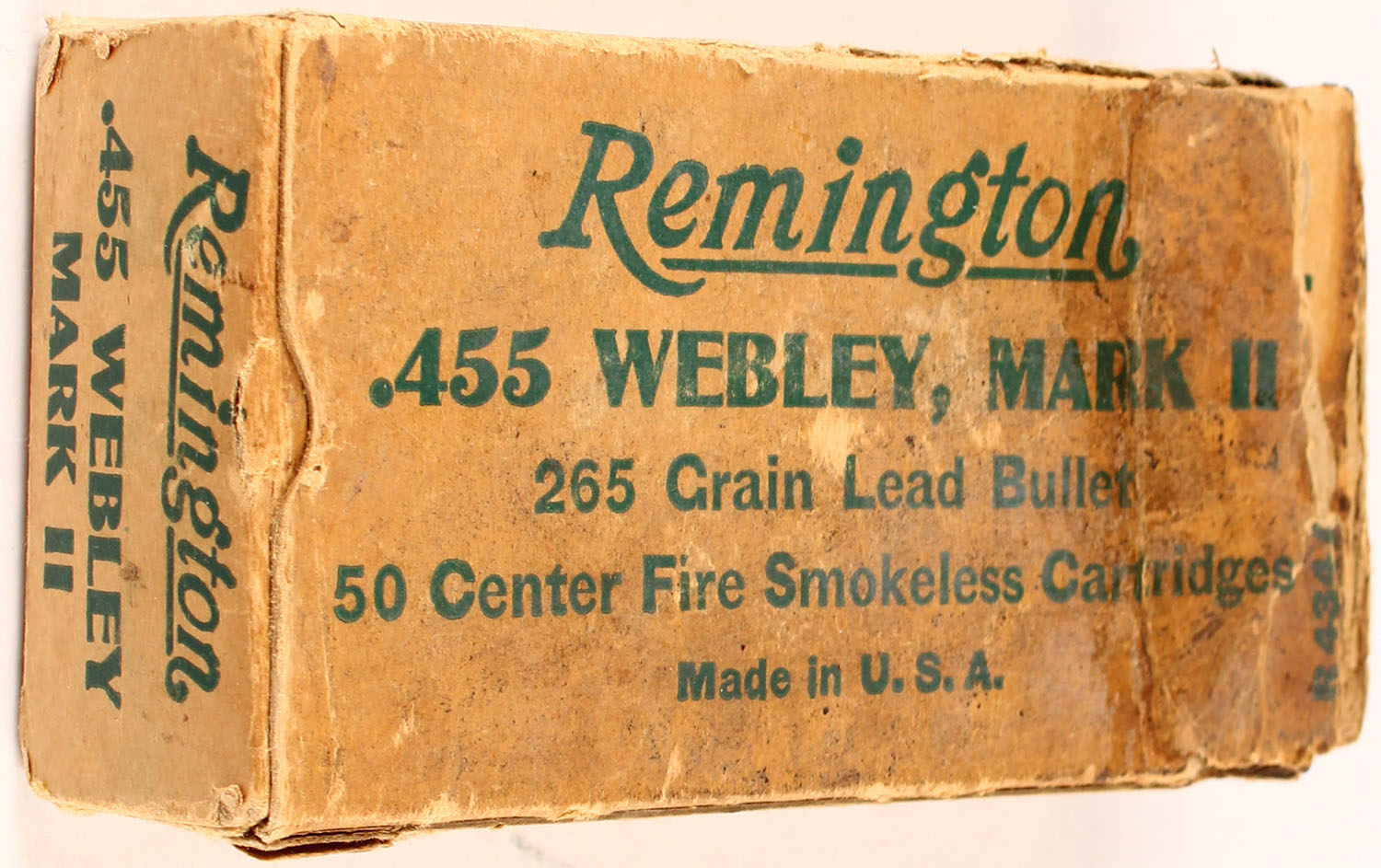 Remington, .455 Webley, Mark II, 265 Gr. Lead Bullet, Smokeless, 1pc, Full, buff box with green print, box has two partial split seams on top, tape repair on right end flap, small chunk of box missing on top label by right side, age soiling, rub marks & edge wear, ammo is very good. Grade: Very Good + - Value: 50 to 150