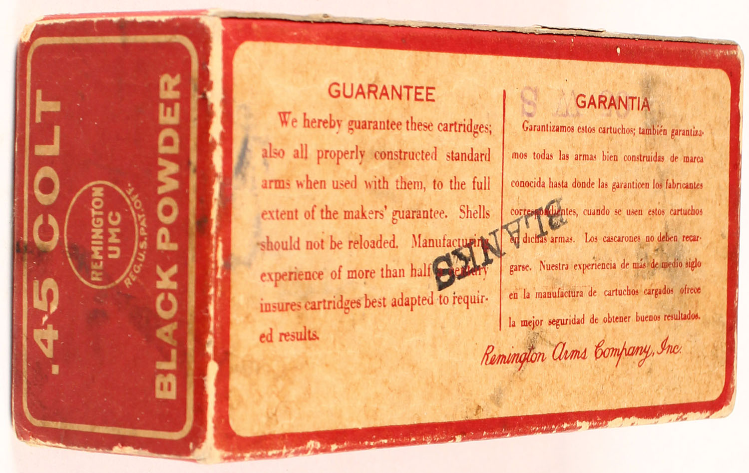 Remington, .45 Colt, OVERSTAMP ''BLANKS'', black powder, 1pc, Full, red box with white print, box is solid with handling wear, rub marks, edge wear & corner wear, ammo is excellent. Grade: Very Good ++ - Value: 30 to 90