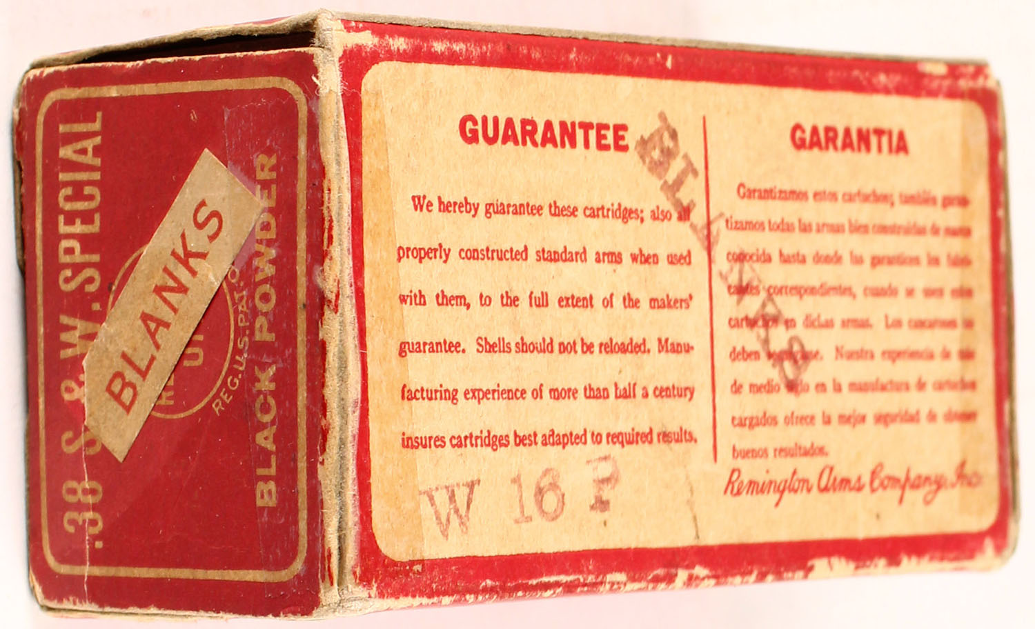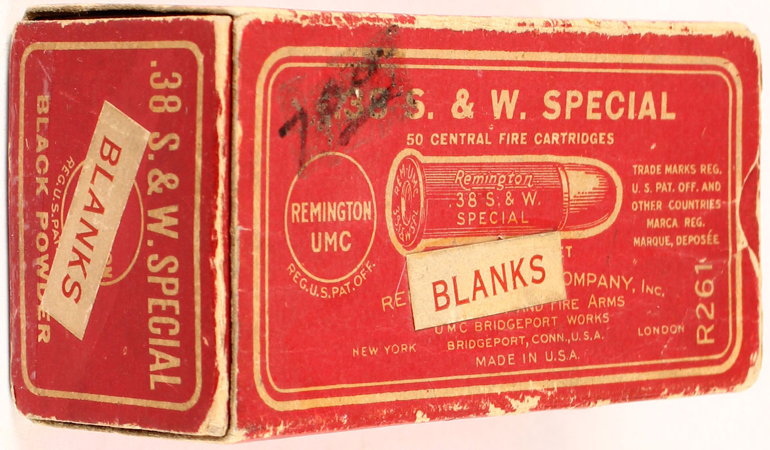 Remington, .38 Smith & Wesson Special Blanks, Black Powder, Full, 1pc. Red & white box with white ''Blanks'' over-label, box is solid with very good to excellent color, some age soiling, minor edge & corner wear, top has been written on, end flaps are solid, ammo is very good. Grade: Very Good ++ - Value: 10 to 40