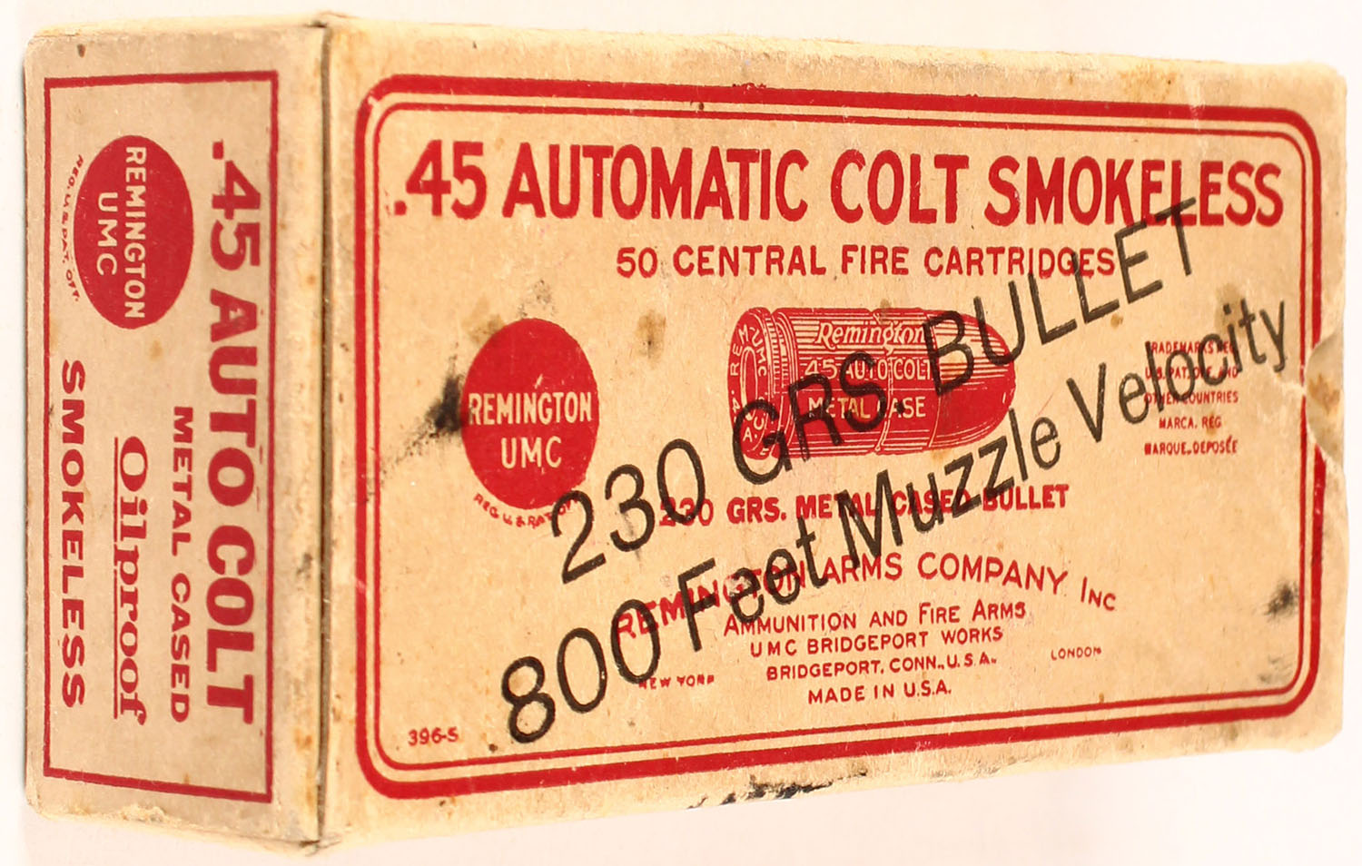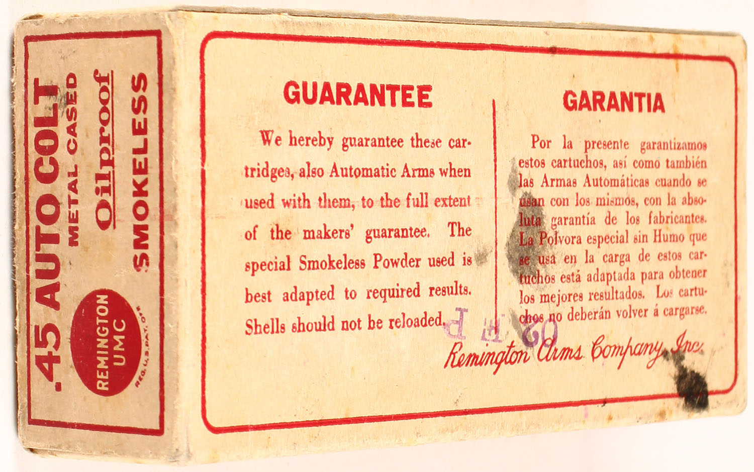 Remington, .45 Automatic Colt, Smokeless, 230 Grain Bullet, 800 Feet Muzzle Velocity, With original receipt from 1924, Partial 39rds. 1pc. Buff & red box with bullet weight and velocity callout over-stamp, box is solid with excellent color, minor age soiling, some staining to the top & bottom, very minor edge & corner wear, end flaps are solid, ammo is excellent. Grade: Excellent - Value: 30 to 120