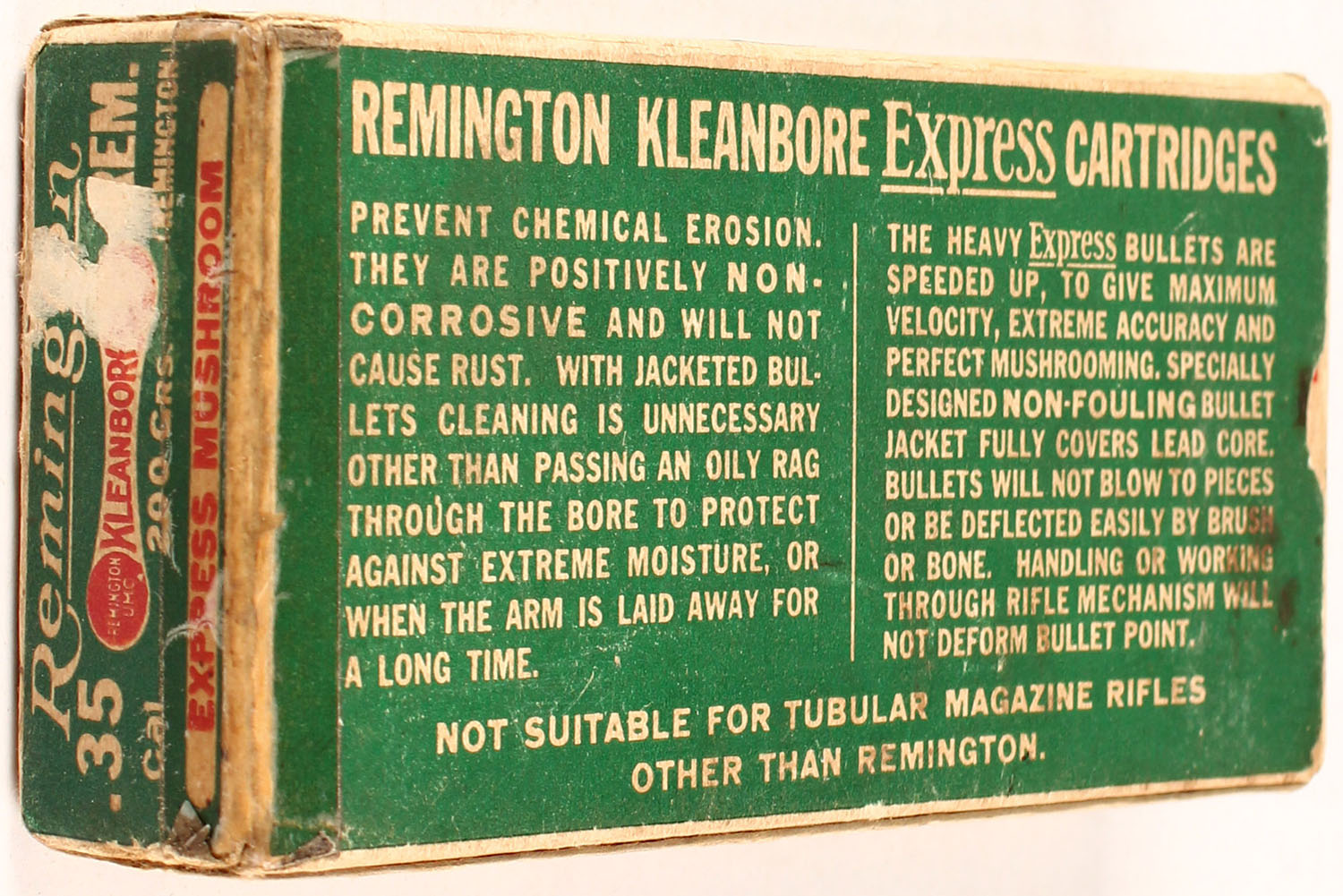 Remington, Kleanbore Express, .35 Remington, 200 Grains Mushroom Bullet, Full, 1pc. Green white & red dog bone/train box, box is solid with very good to excellent color, some age soiling, stain on top, right end flap has been torn & taped, minor edge & corner wear, left end flap is solid, ammo is very good to excellent. Grade: Very Good + - Value: 40 to 120
