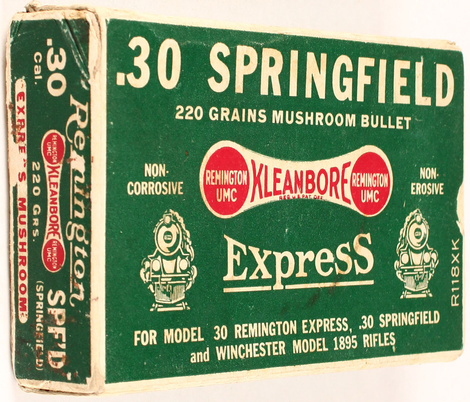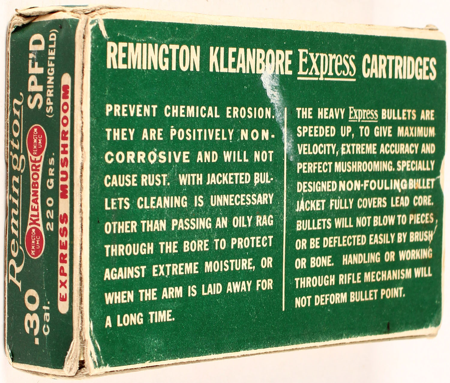 Remington, Kleanbore Express, .30 Springfield, 220 Grains Mushroom Bullet, Partial 19rds., 1pc. Green white & red dog bone/train box, box is solid with excellent color, minor corner wear, very minor edge wear, right end flap has been torn & taped, left end flap is solid, ammo is excellent. Grade: Excellent - Value: 50 to 150