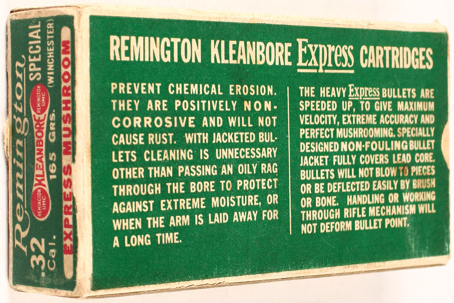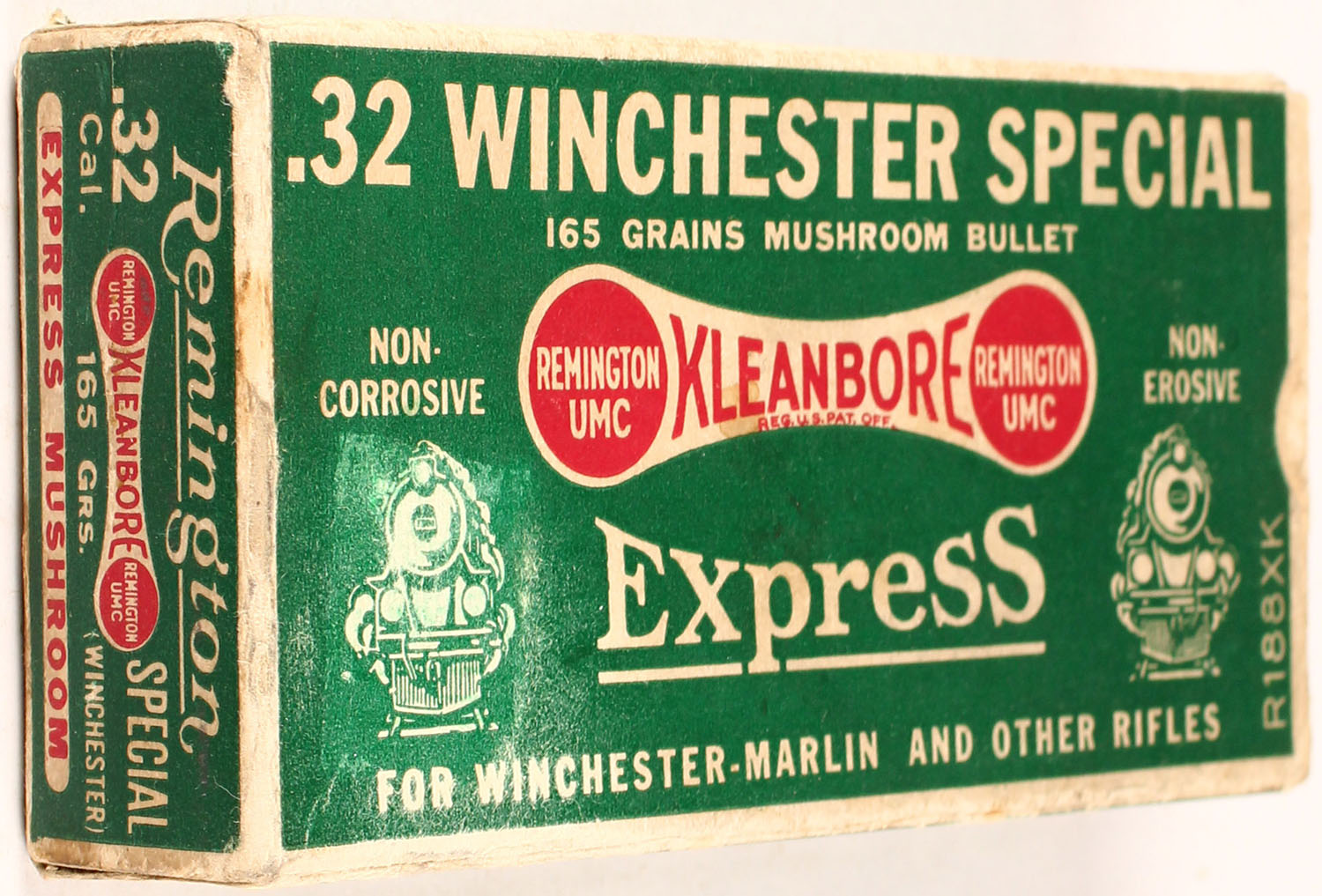 Remington, Kleanbore Express, .32 Winchester Special, 165 Grains Mushroom Bullet, Full, 1pc. Green white & red dog bone/train box, box is solid with excellent color, minor age soiling & shelf wear, minor edge & corner wear, end flaps are solid, ammo is excellent. Grade: Excellent - Value: 100 to 300